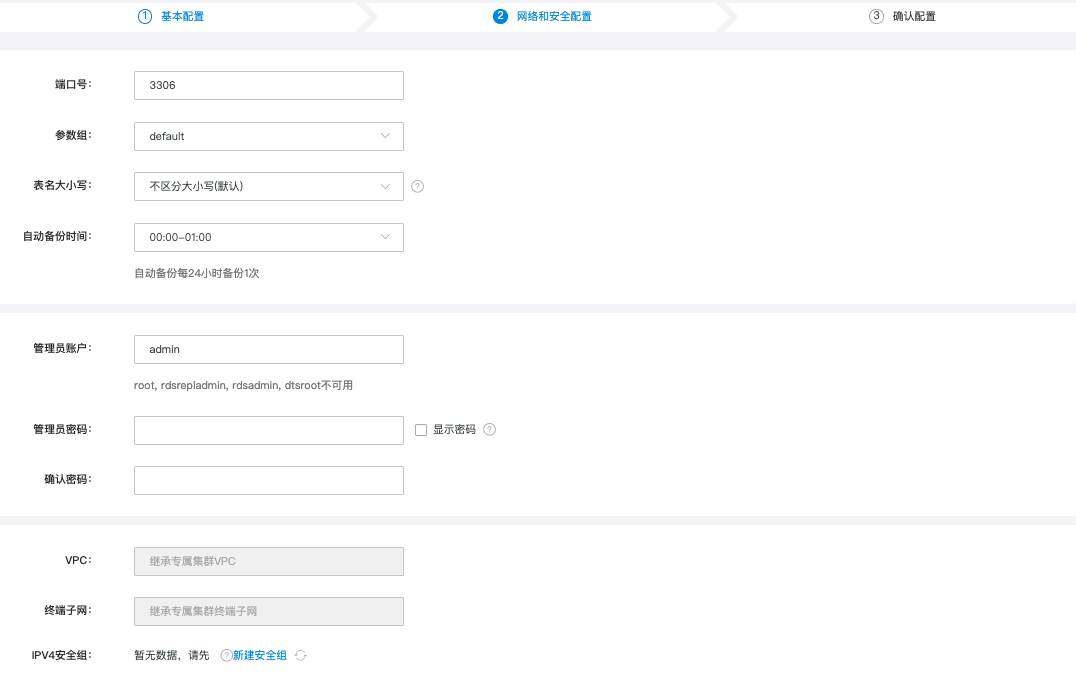 点击下一步进入网络和安全配置,参照下列信息完成配置,确认后实例创建完成。