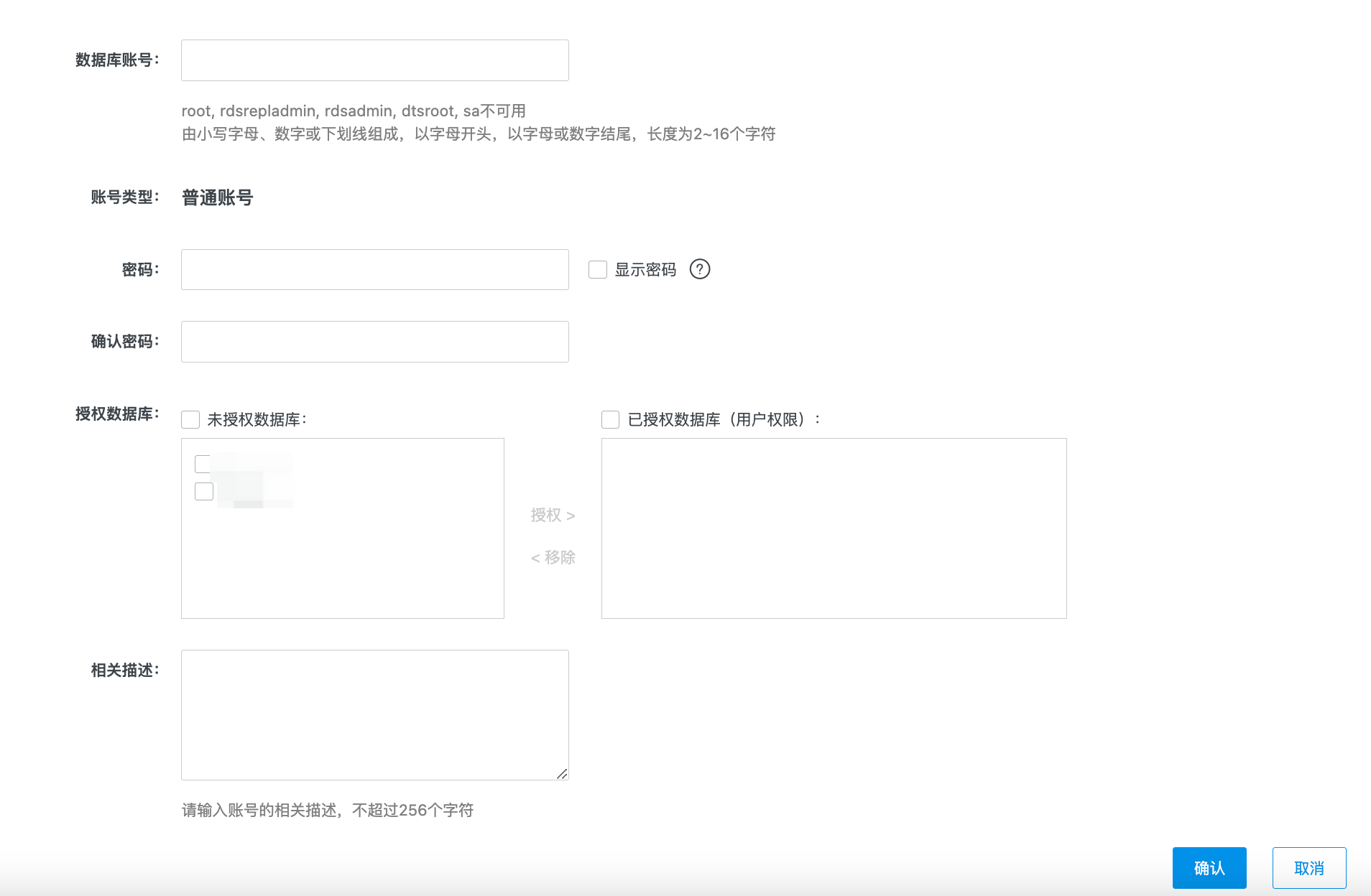 相关描述 | 数据库账号的备注说明。 |