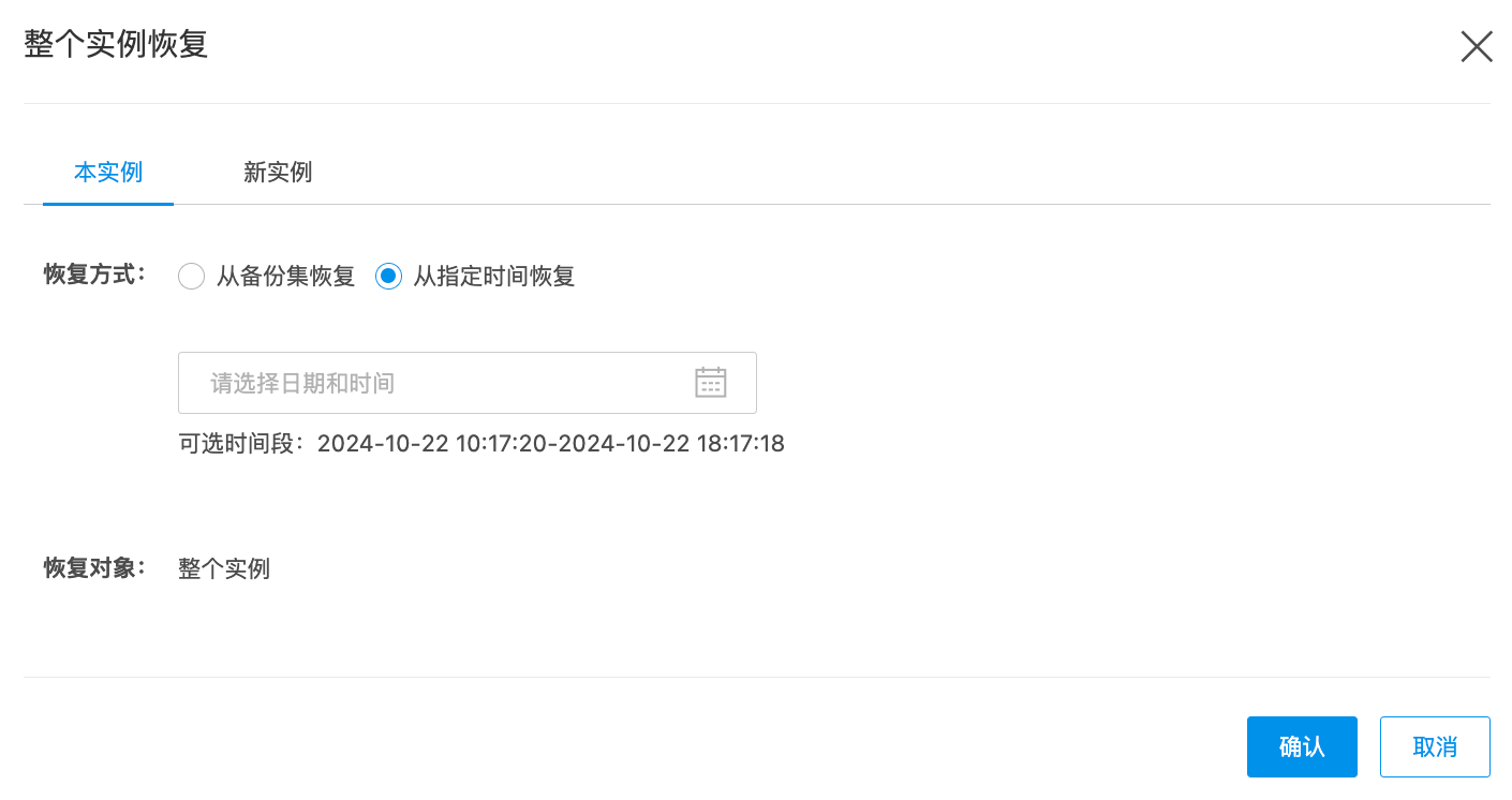 点击整个实例恢复,选择目标时间点,您可以将当前实例恢复至任意一时间点。
