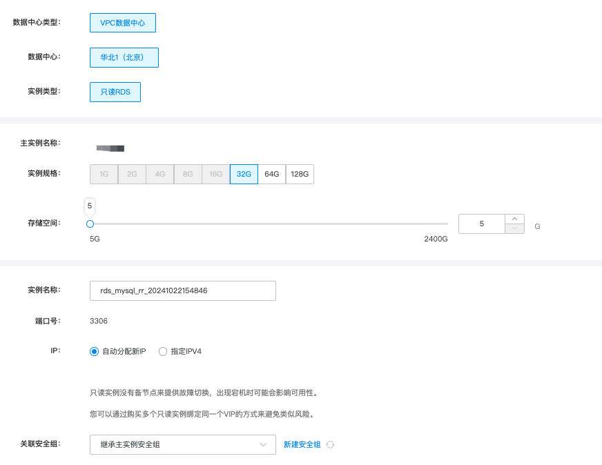 IP | 只读实例的IP设置,可自动分配或指定IP。 |