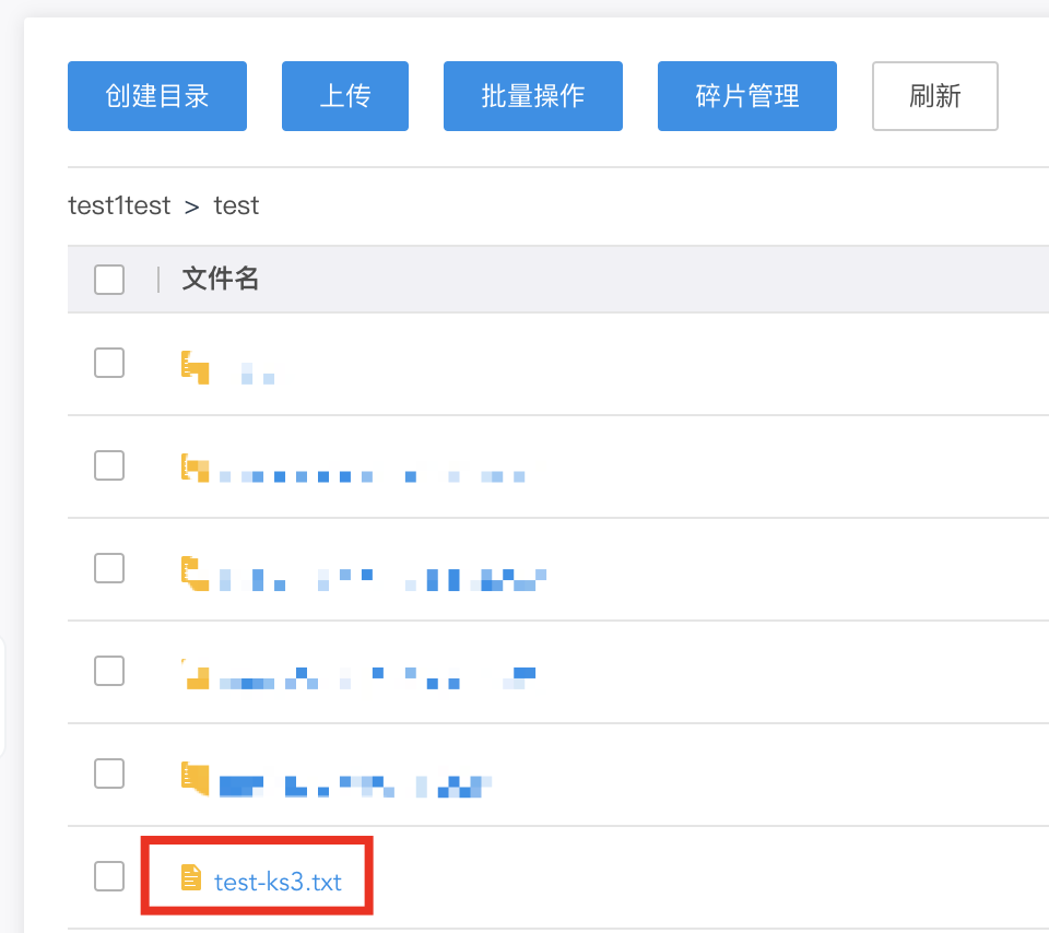 kubectl exec test-ks3-69c67b88d8-9zq87 -- touch /data/test-ks3.txt可在控制台对应目录下看到test-ks3文件已创建成功。