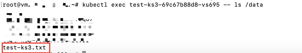 kubectl exec test-ks3-69c67b88d8-vs695 -- ls /data从返回的结果可看到已共享了先前创建的文件。