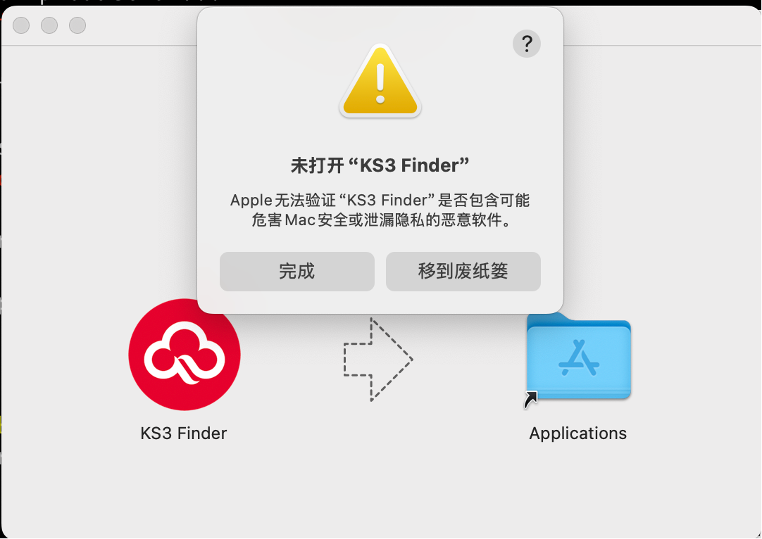 当您通过浏览器下载安装KS3 Finder的macOS arm版时,若出现如下所示的异常警告,请在终端执行以下命令:xattr -r -d com.apple.quarantine "/Applications/KS3 Finder.app",执行成功后重新打开KS3 Finder即可解决。