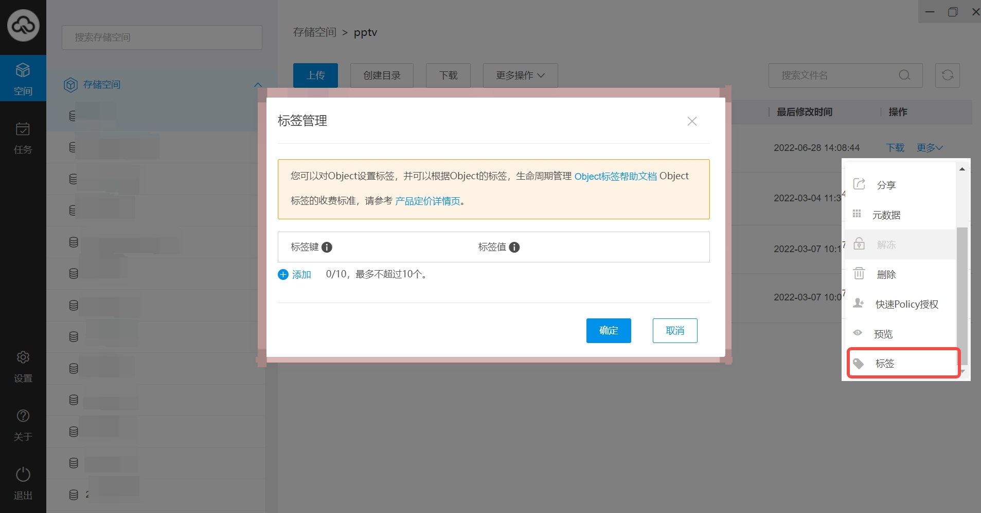 找到需要设置标签的Object名称,点击右侧的【更多】➡【标签】,可添加、修改、删除文件标签。