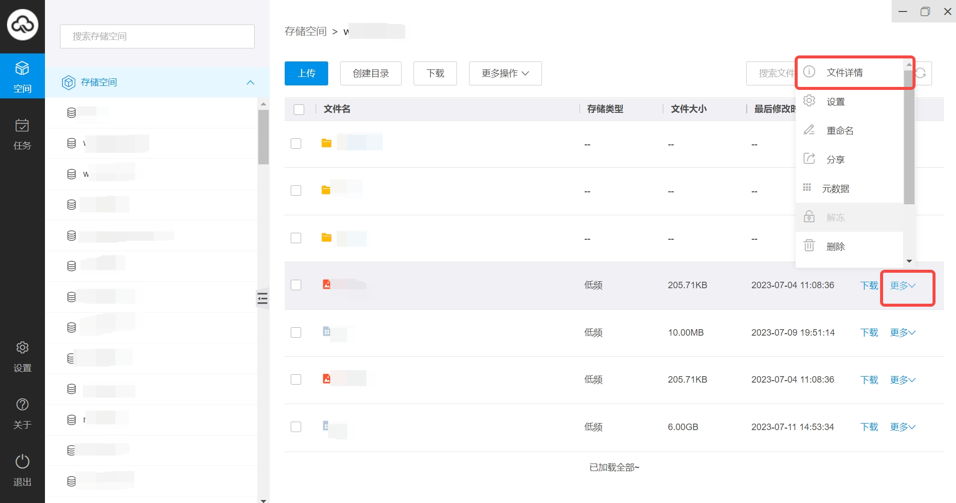 找到需要设置元数据的Object名称,点击右侧的【更多】➡【元数据】,可添加、修改、删除文件的标准元数据以及自定义元数据信息。
