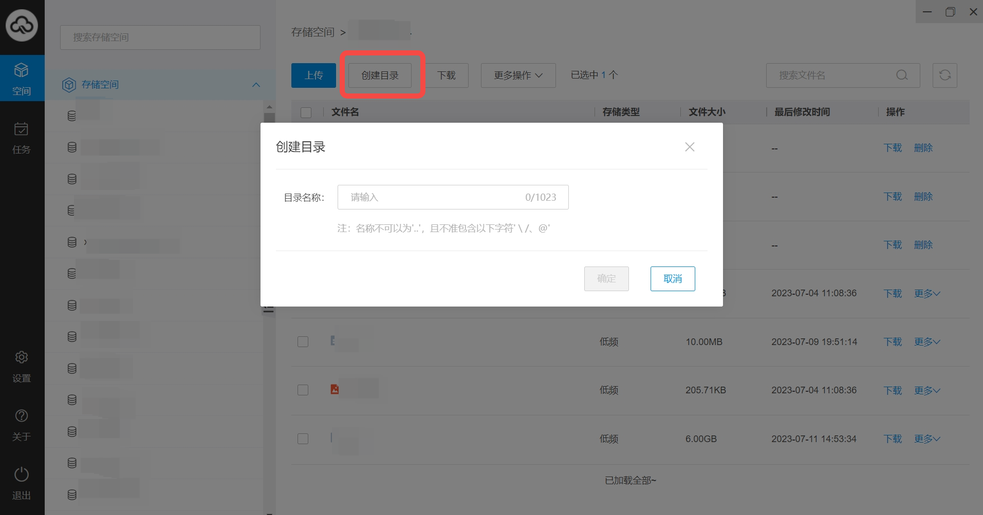 在存储空间内,选择【创建目录】。输入正确文件夹名并点击【确认】,完成新建文件夹操作。