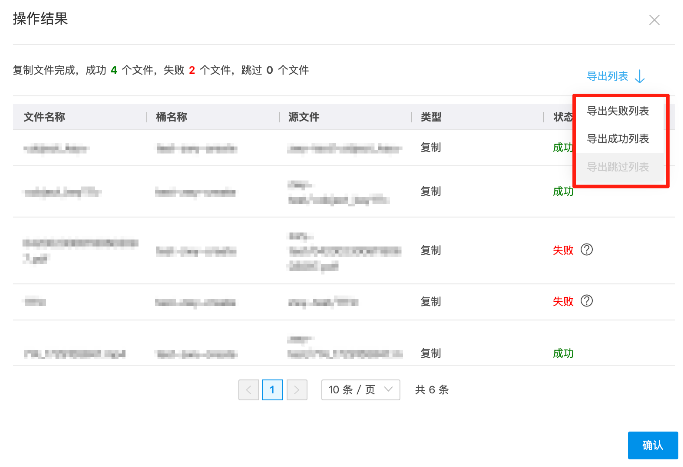 批量操作文件【删除、设置、解冻、标签、元数据、复制、移动】/文件夹【删除、复制】后,支持查看操作结果,自动统计成功、失败、跳过【仅复制和移动操作存在此状态】文件总数,并支持导出成功、失败、跳过的文件列表。