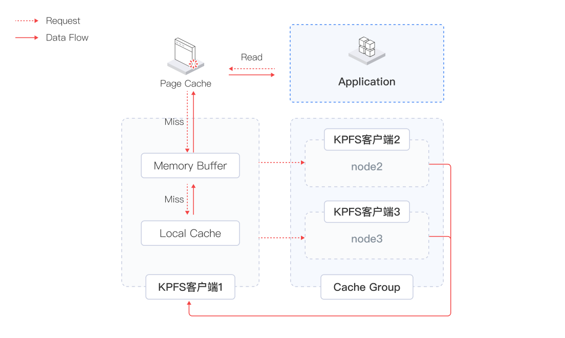 读请求会依次请求内核分页缓存、客户端内存缓冲区、本地缓存,分布式缓存组,缓存中没找到对应数据时才会读取KPFS,从缓存组获取的数据,依然会缓存到本地盘。