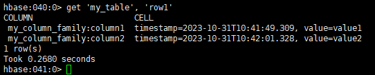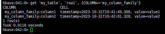 获取my_table表的row1行的所有数据:get 'my_table', 'row1'