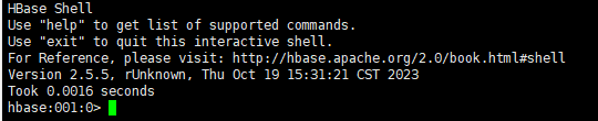 成功连接后,控制台打印版本信息和hbase:001:0>提示符。运行help命令查看HBase Shell命令列表。