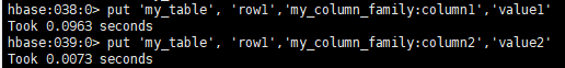 put 'my_table', 'row1', 'my_column_family:column2', 'value2'