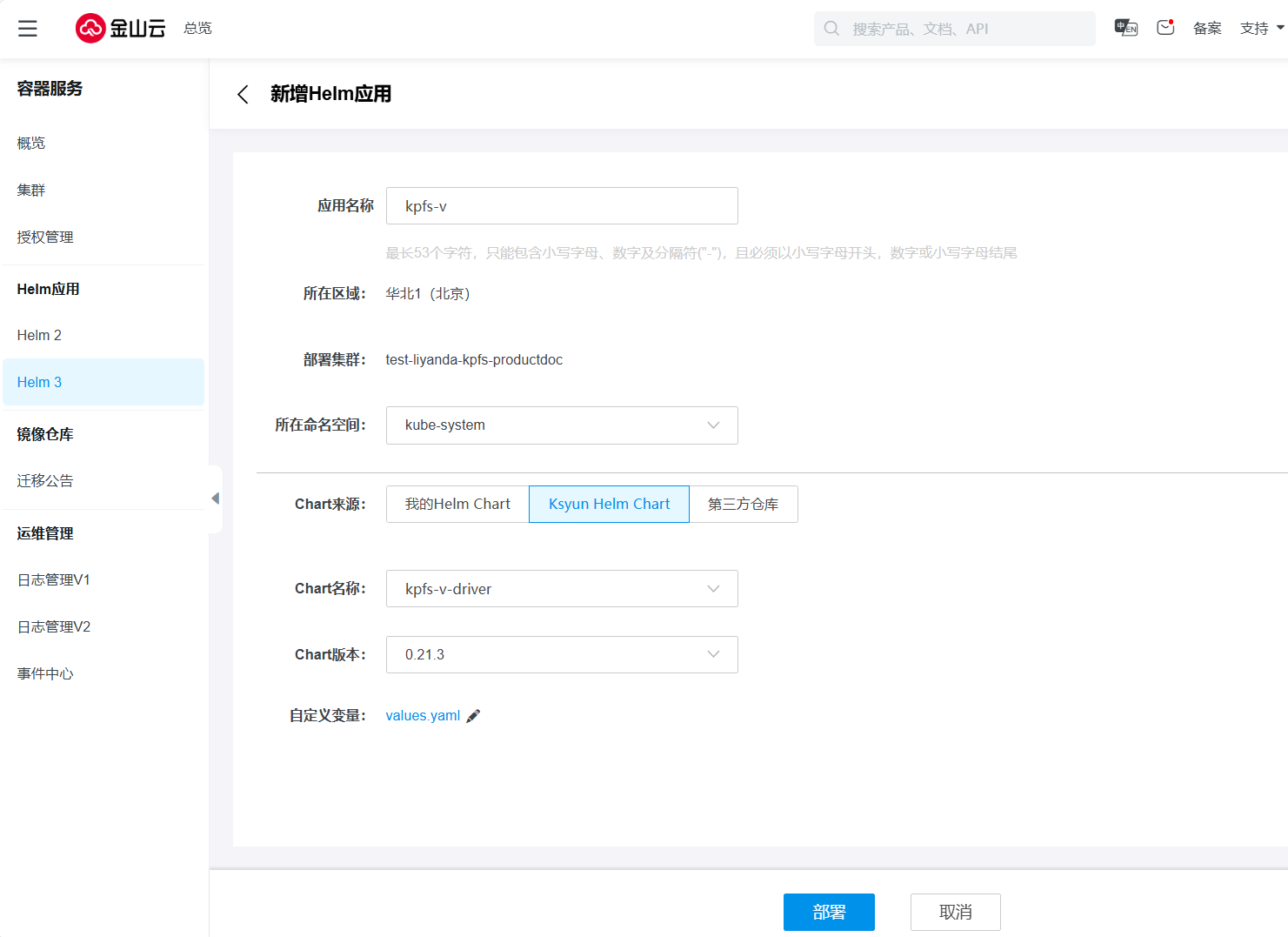 选择Chart来源,Ksyun Helm Chart,选择kpfs-v-driver,点击部署。