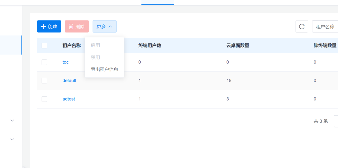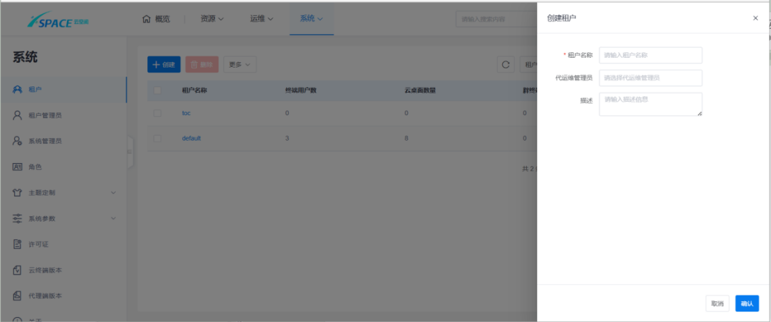 (1) 为了适应公有云运营模式需求,云空间采用多级租户管理架构,租户管理员能够对本租户范围内的产品和资源进行自服务管理,可以创建多个租户,租户名称自定义,可以导出租户信息。