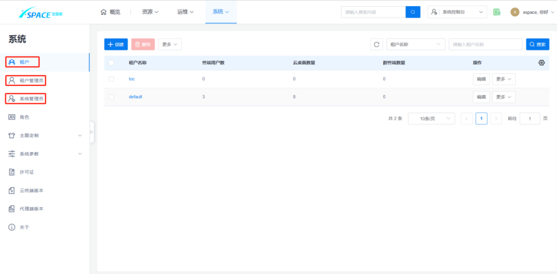 (1) 为了适应公有云运营模式需求,云空间采用多级租户管理架构,租户管理员能够对本租户范围内的产品和资源进行自服务管理,可以创建多个租户,租户名称自定义,可以导出租户信息。