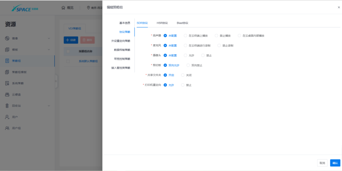 a) 支持协议策略管理,包括对扬声器、麦克风、摄像头、剪切板、文件夹、打印机等设备重定向的策略进行配置。