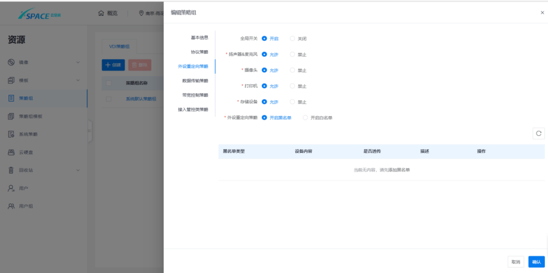 b) 支持外设重定向策略管理,包括对扬声器、麦克风、摄像头、打印机、存储设备进行允许或禁止的快速设置,支持USB外设重定向黑白名单设置,支持按照设备类型或厂商号、产品号进行设置,允许在黑白名单中针对特定的厂商号、产品号的特定设备进行反选设置。