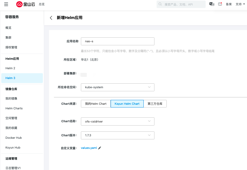 选择Chart来源,Ksyun Helm Chart;选择Chart名称,ofs-csidriver;选择Chart版本,1.7.6版本的POSIX挂载支持挂载文件系统多级子目录,1.7.6以下版本的POSIX挂载仅支持挂载文件系统一级子目录。