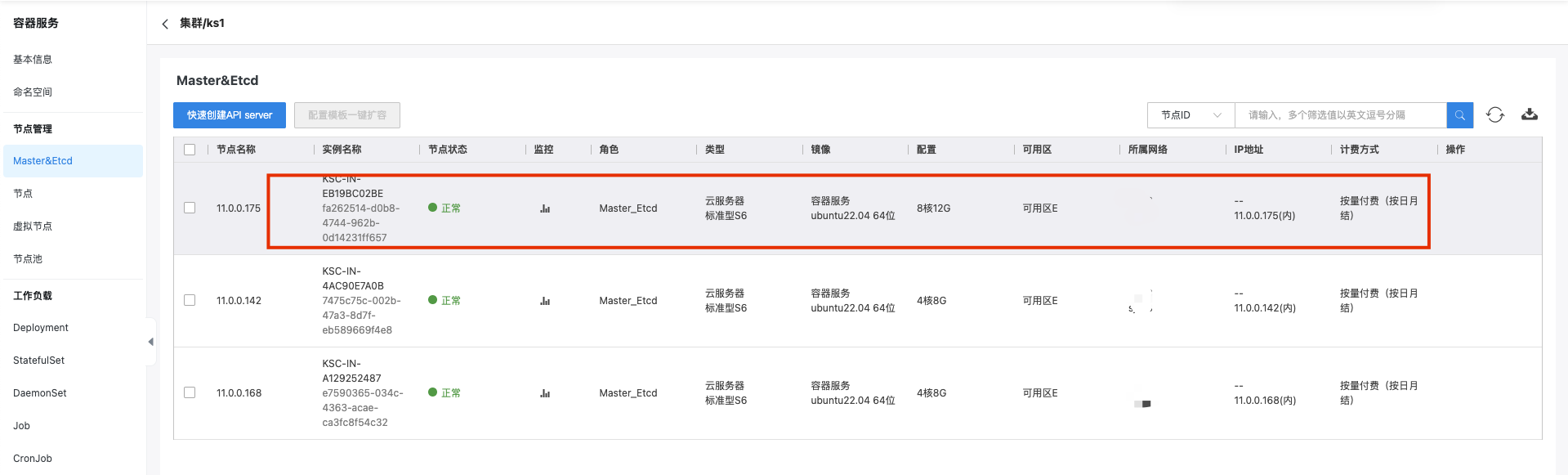 在集群列表页面,单击目标集群名称,然后在左侧导航栏,选择节点管理 > Master&Etcd。