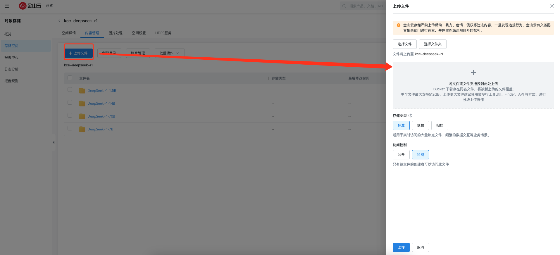 由于大模型体积较大,建议将大模型存放至对象存储KS3或性能更佳的高性能文件存储KPFS中,以PVC形式挂载至运行大模型工具(vLLM/Ollama)的Pod中,本文将选用KS3来存储DeepSeek R1大模型。