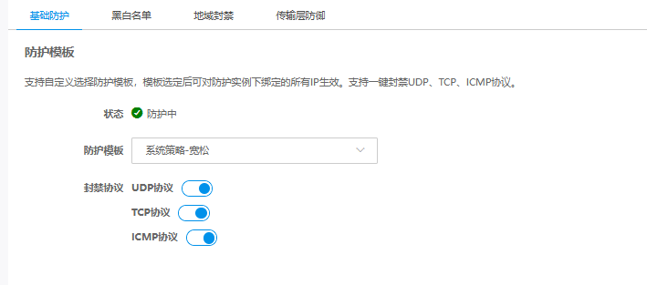 选择基础防护,开启需要封禁的协议类型。
