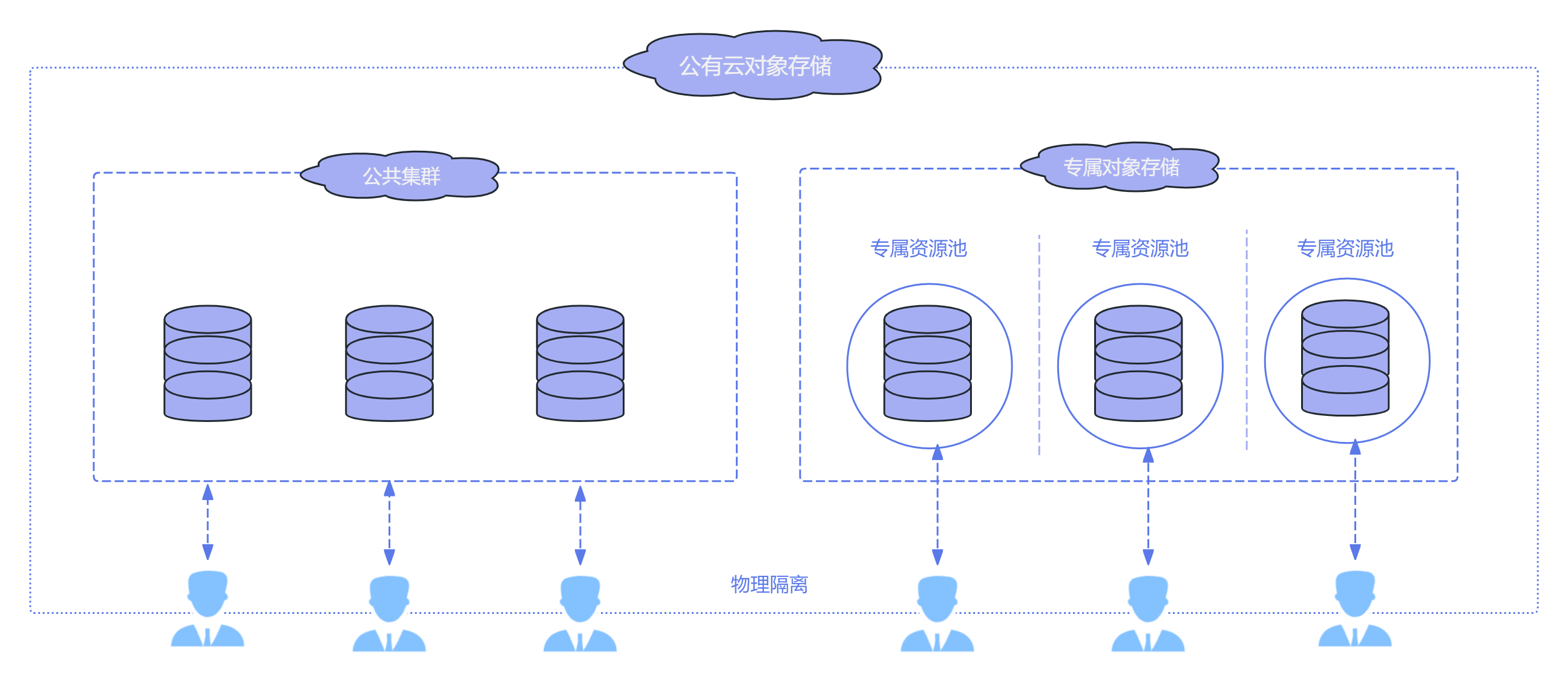 用户独享云上资源:在专属对象存储集群内,所有资源由用户独享,用户可以按需使用资源,满足与其他用户资源隔离的诉求。