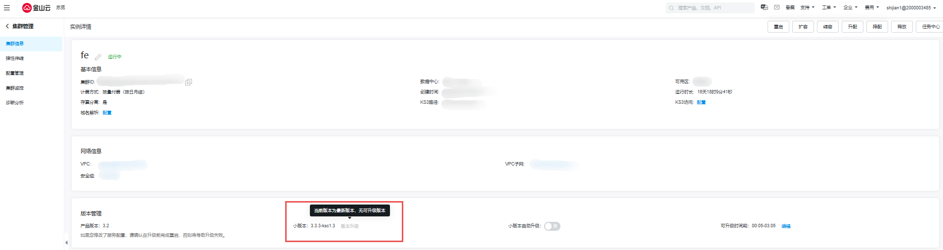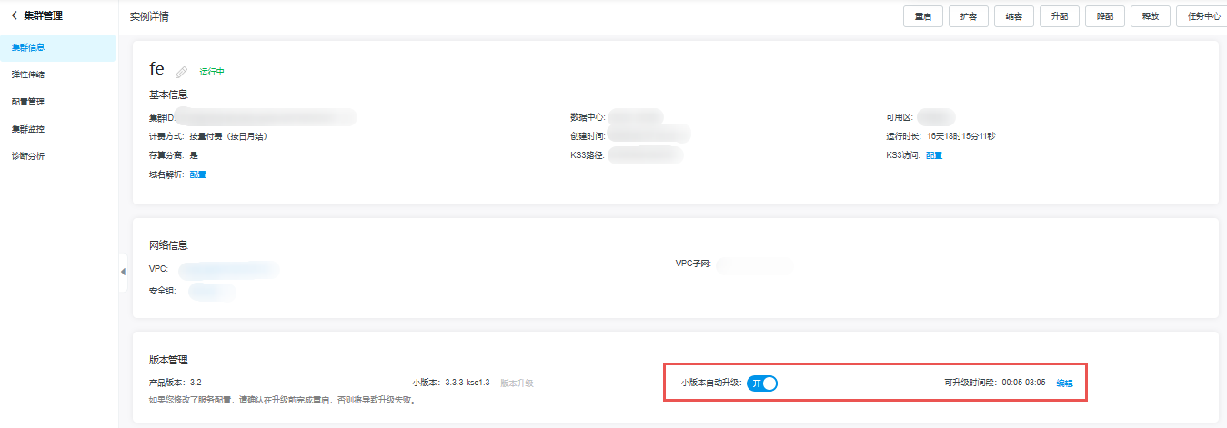 进入集群详情页面,在版本管理>小版本查看是否有可升级的版本,如有则"版本升级"可点;如“版本升级”按键置灰则说明您使用的版本是金山云StarRocks大版本下的最新版本。