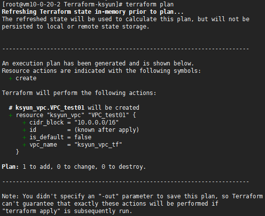 # vim VPC.tf //创建一个VPC实例 resource "ksyun_vpc" "VPC_test01" { vpc_name = "ksyun_vpc_tf" cidr_block = "10.0.0.0/16" }