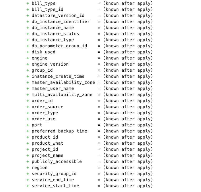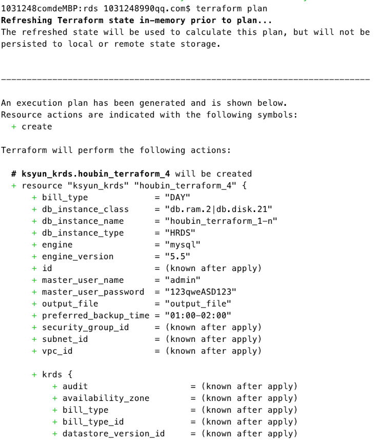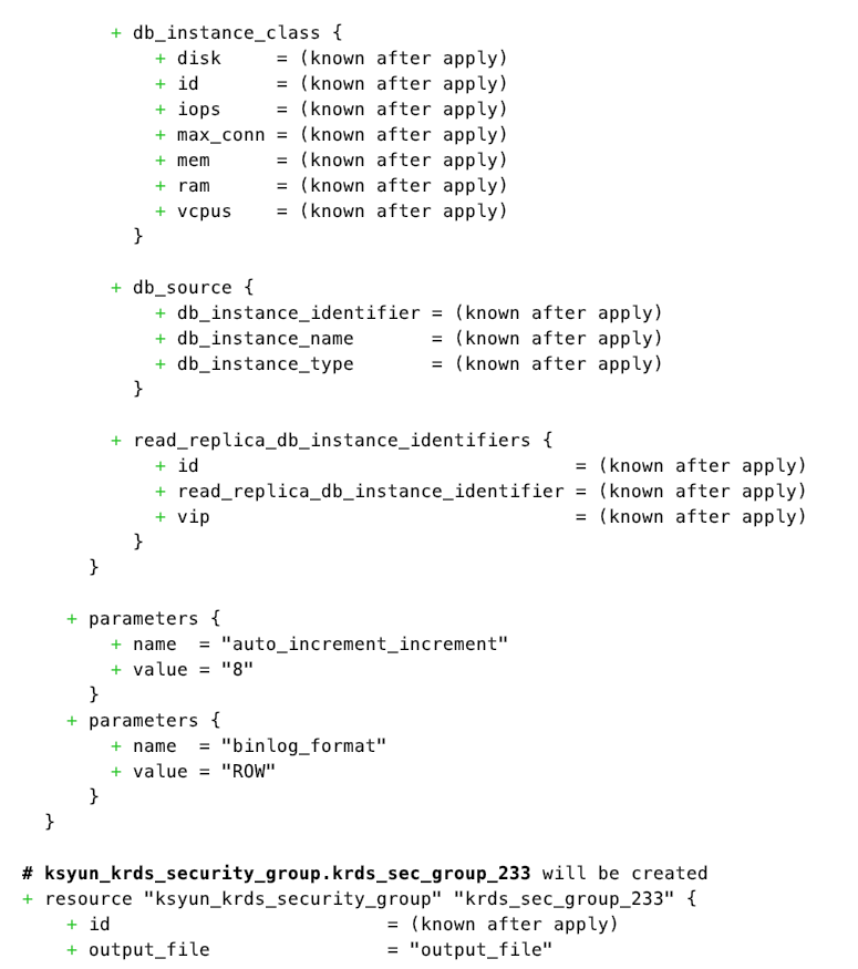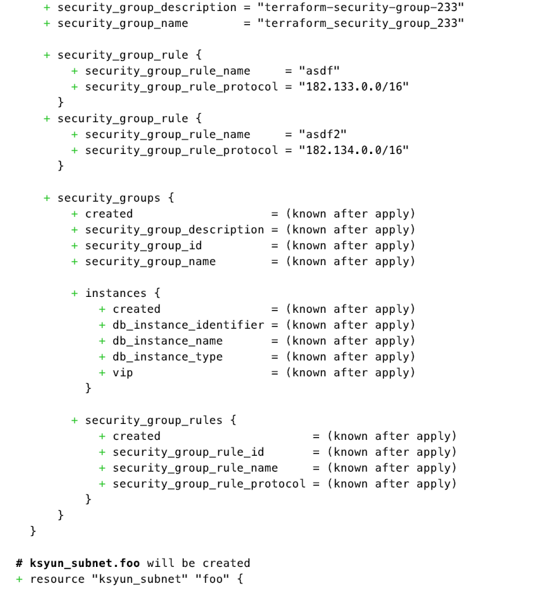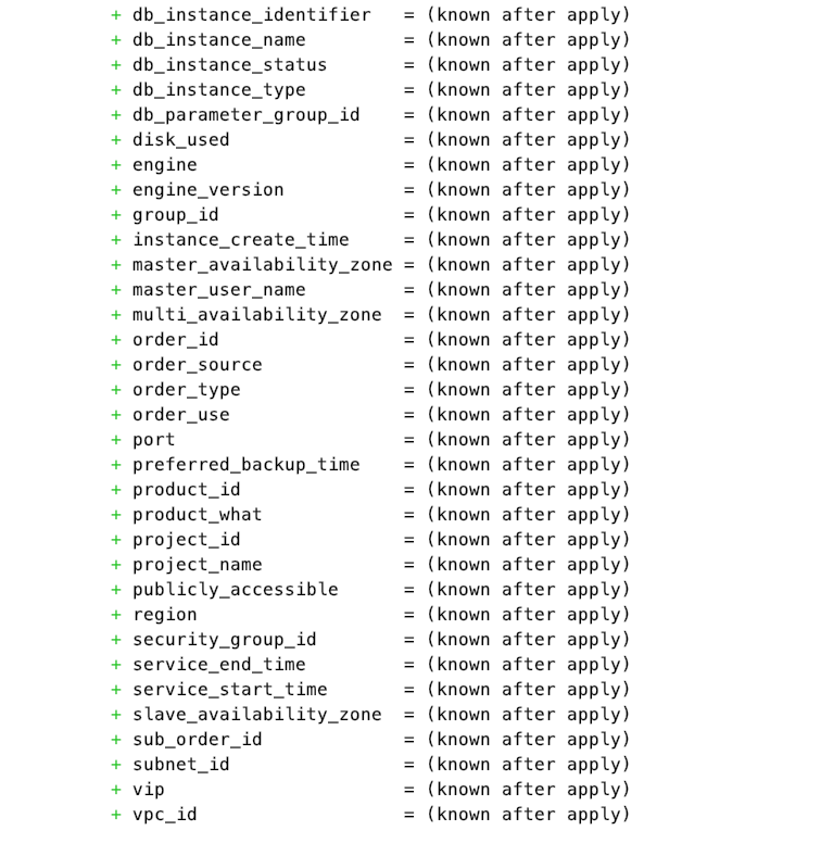 }执行 terraform plan 查看部署计划,这里参数前面的+代表新添加的资源,当销毁资源时,参数前面对应的符号会变为-;更改一些参数需要重新部署资源时,该资源前面的符号为-/+。
