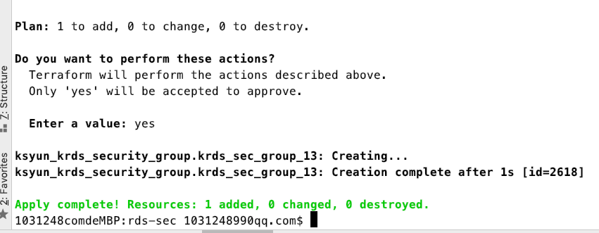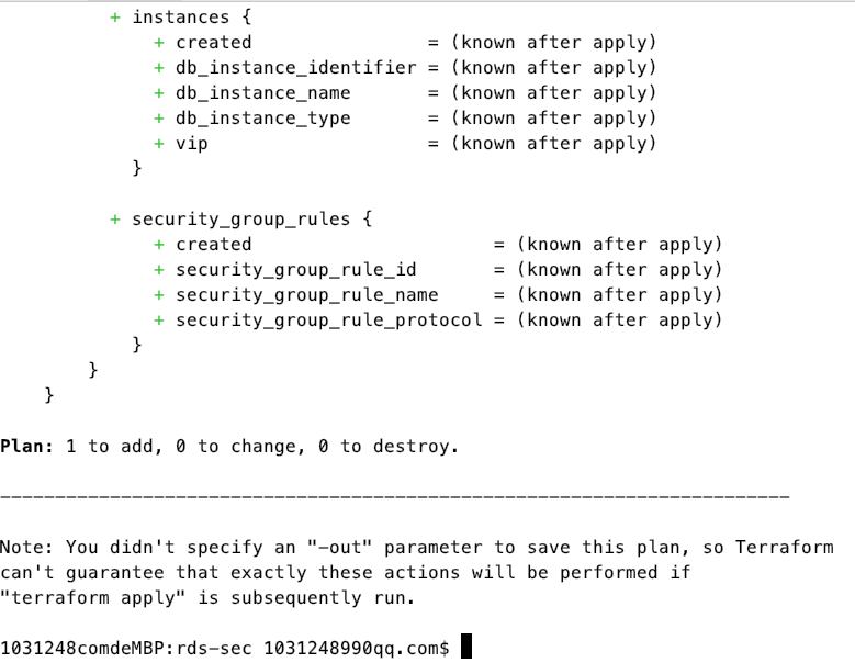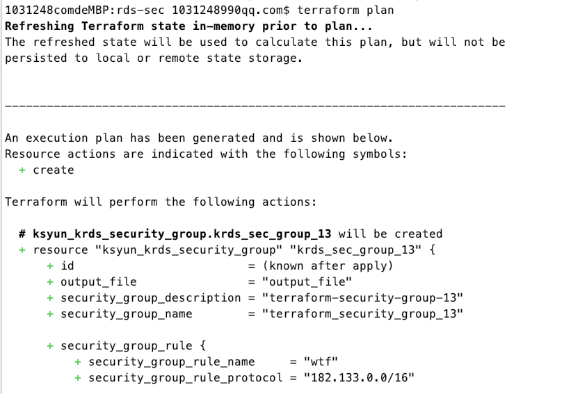 }执行 terraform plan 查看部署计划,这里参数前面的+代表新添加的资源,当销毁资源时,参数前面对应的符号会变为-;更改一些参数需要重新部署资源时,该资源前面的符号为-/+。