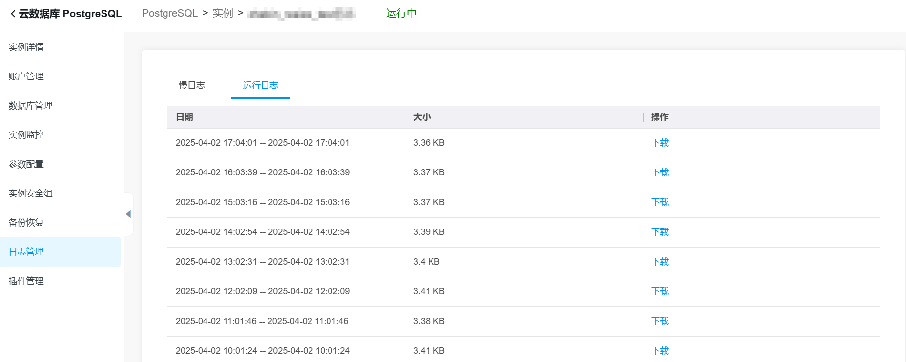 在PostgreSQL实例详情页左侧导航栏,点击日志管理,进入日志管理页面。