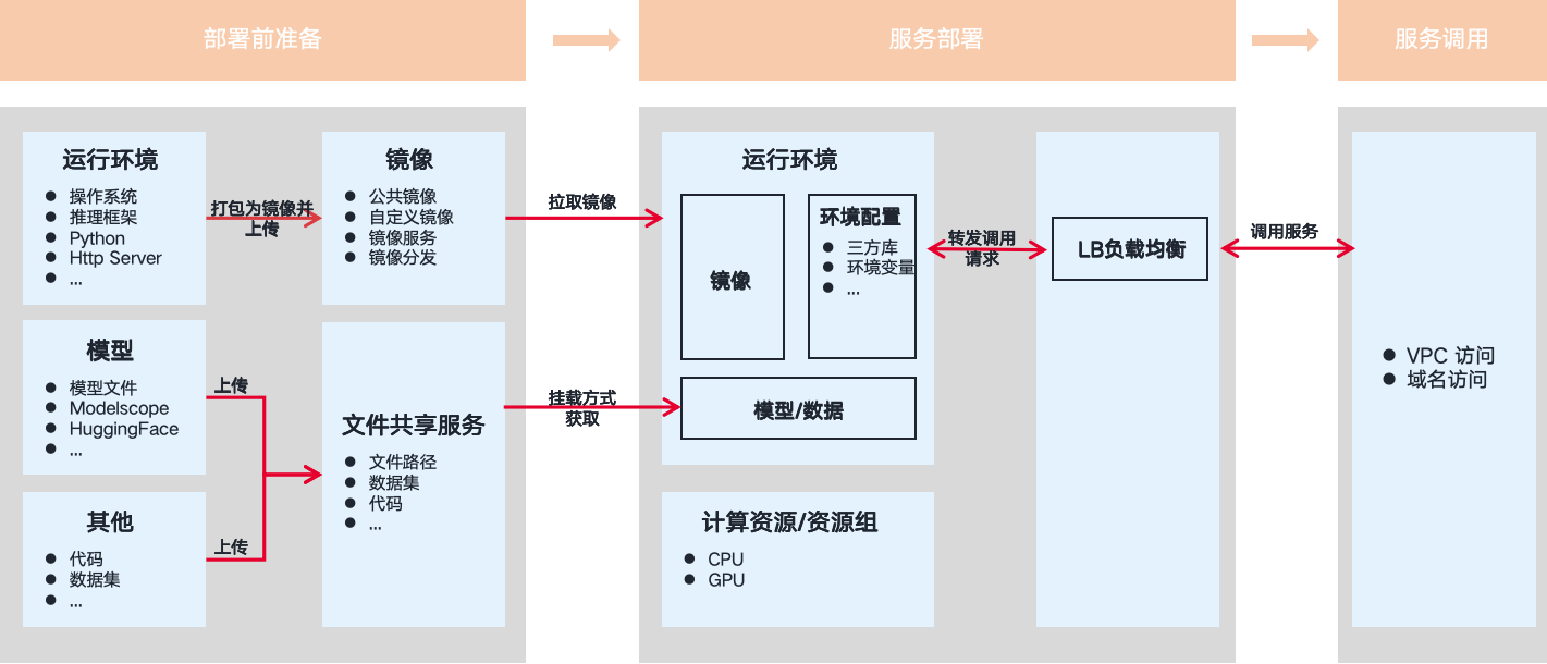 准备镜像:用户需配置基础运行环境,包括操作系统(如Linux)、推理框架(如PyTorch/TensorFlow)、HTTP服务器等,并通过自定义镜像的方式推送到私有云仓库。