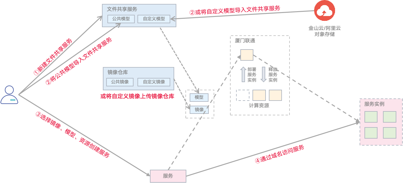 准备模型文件和数据:将模型文件、代码、数据集上传至文件共享服务,或通过金山云对象存储、阿里云对象存储一键导入到文件共享服务,为后续部署提供基础数据。