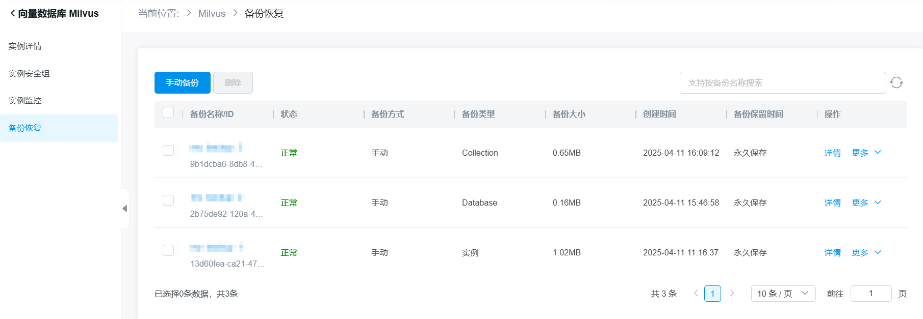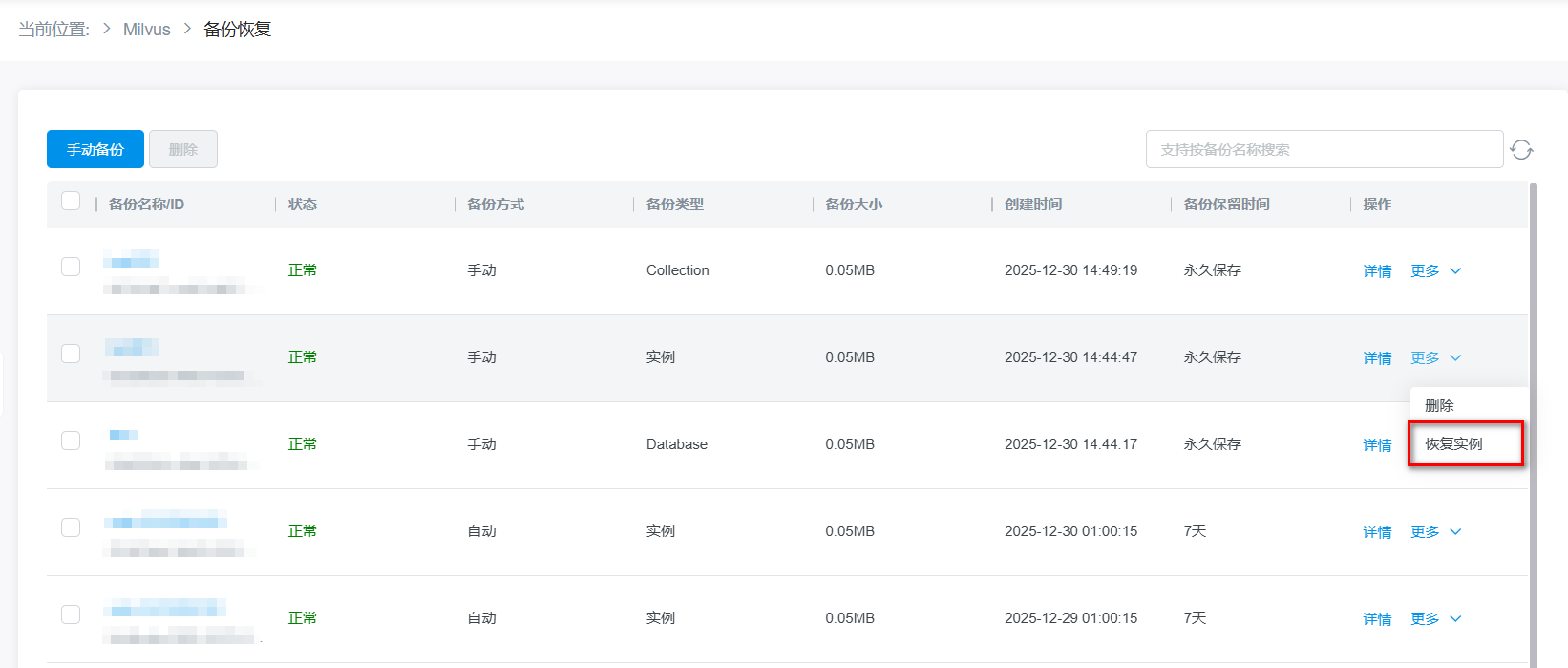 向量数据库Milvus支持备份恢复功能。系统每天按照实例级别自动进行一次备份,同时支持用户自定义按照实例、库、Collection级别进行手动备份,并支持按照备份文件恢复至本实例、新实例或其他实例。