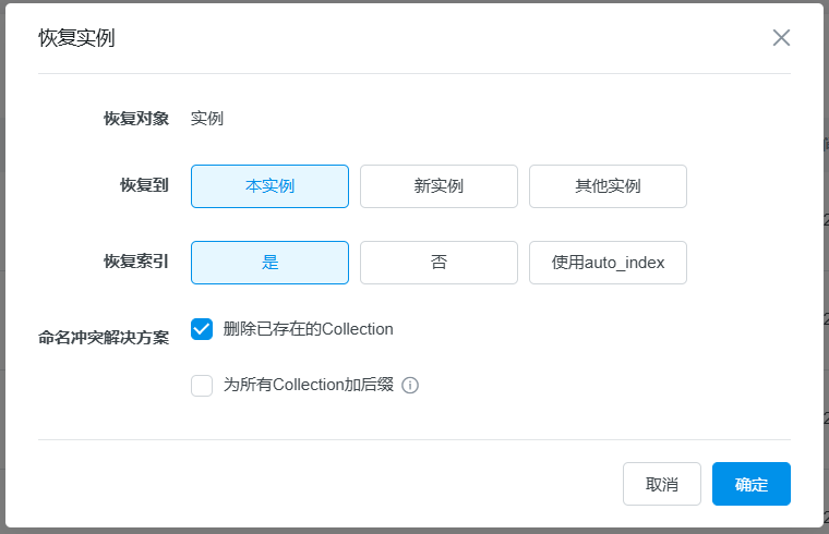 选中备份(支持按照实例、库、Collection级别进行恢复),点击操作栏更多中的恢复实例,弹出恢复实例选择框,选择恢复目标实例(本实例、新实例、或其他实例)、恢复索引(是、否或使用auto_index)、及命名冲突解决策略,点击确定,即可按照选择的配置进行数据恢复。