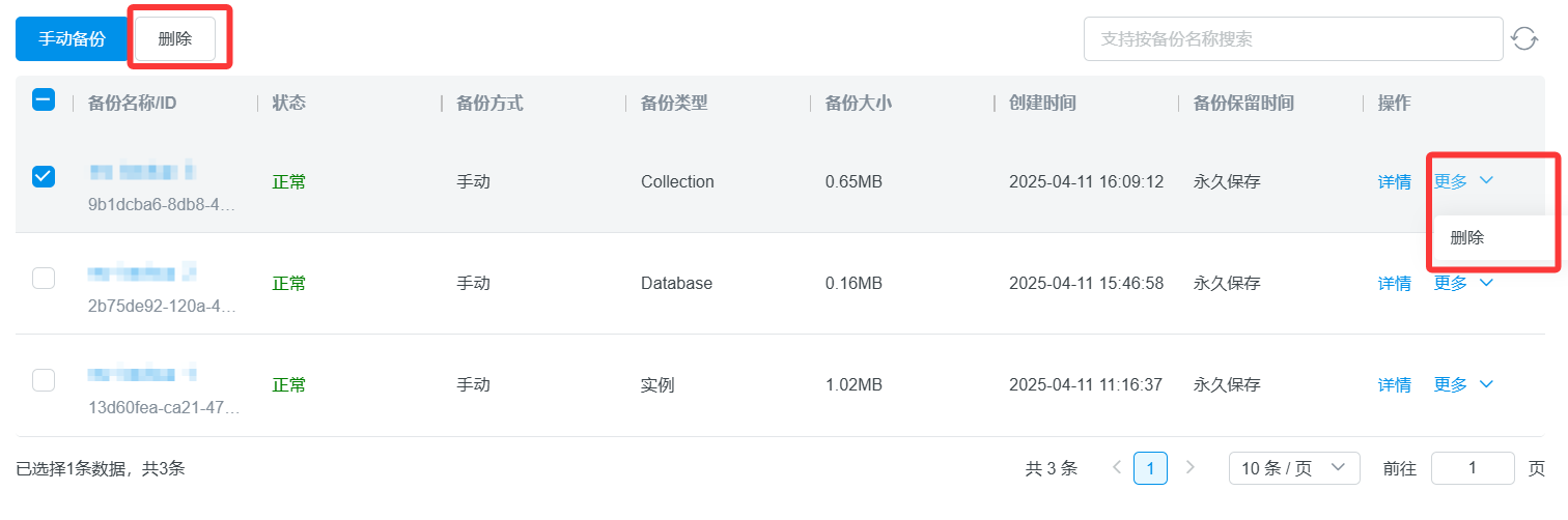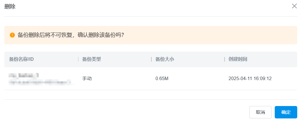 选中备份,点击操作栏更多中的删除,或者点击上方的删除按钮,弹出删除备份窗口后,点击确定,即可删除备份,支持批量删除。