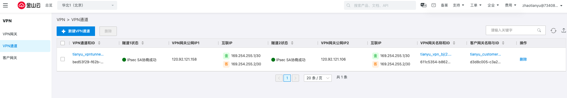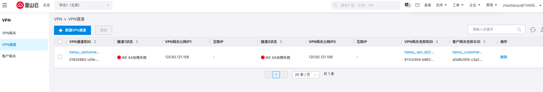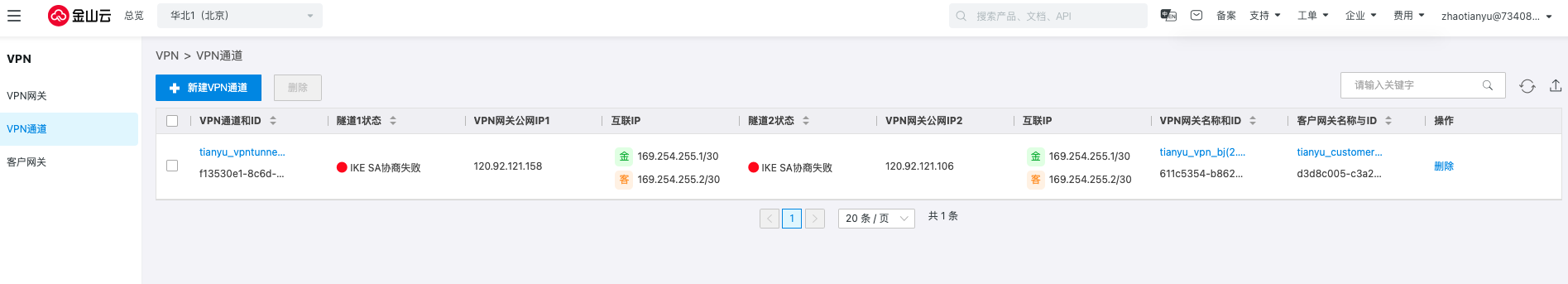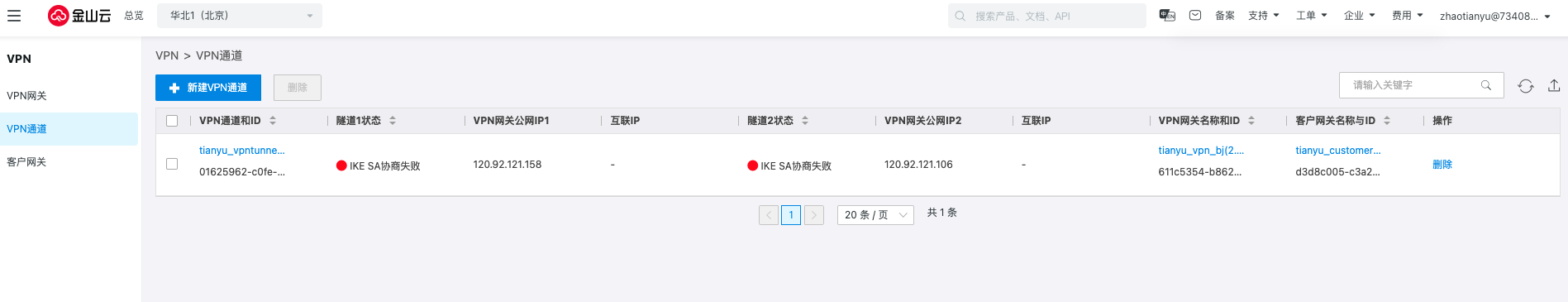 单击创建,此时北京地域下的VPN通道两条隧道的协商状态都是失败的。