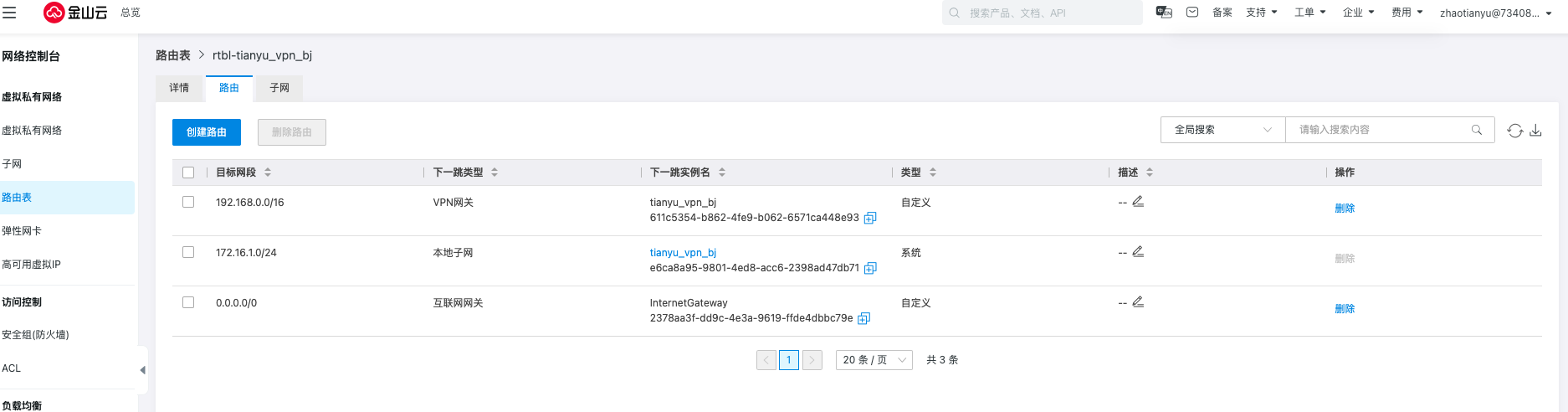 VPC | VPCA:tianyu_vpn_bj/752b29fb-f7eb-4c00-bc2d-efad98fafa55(172.16.0.0/16) VPCB:tianyu_vpn_qy/6518743f-0942-4eda-9b5e-83dd692b7d30(192.168.0.0/16) |