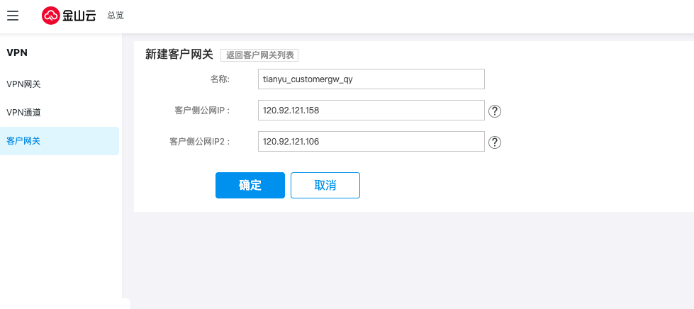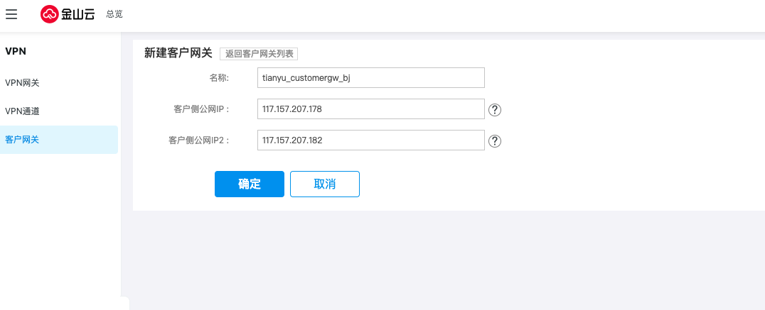 名称 | 不填写默认“Ksc_customer_gw” |