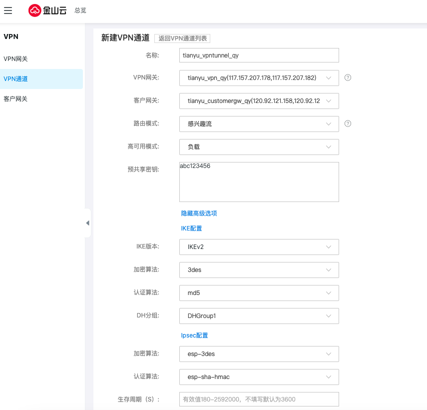 预共享密钥 | 预共享密钥是用于验证IPsec连接的Unicode 字符串,金山云侧和客户侧必须使用相同的预共享密钥 |