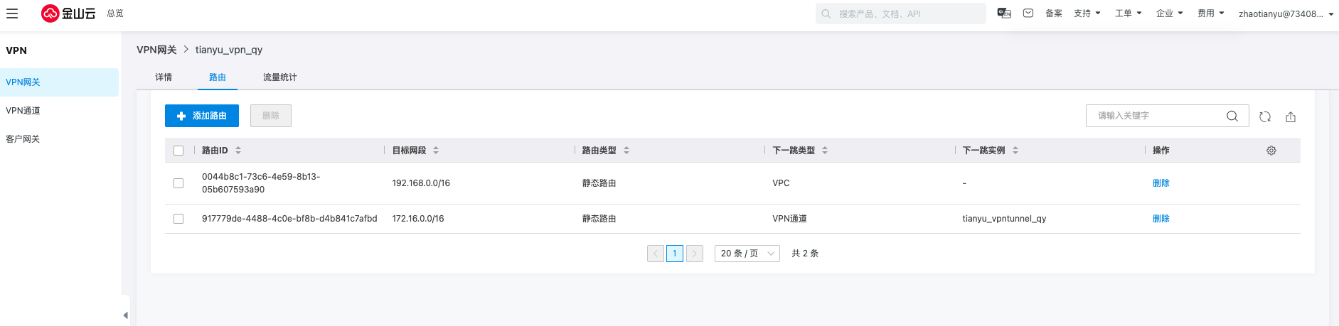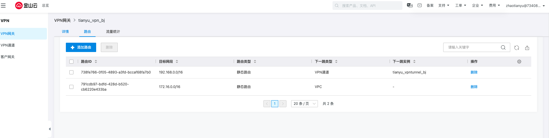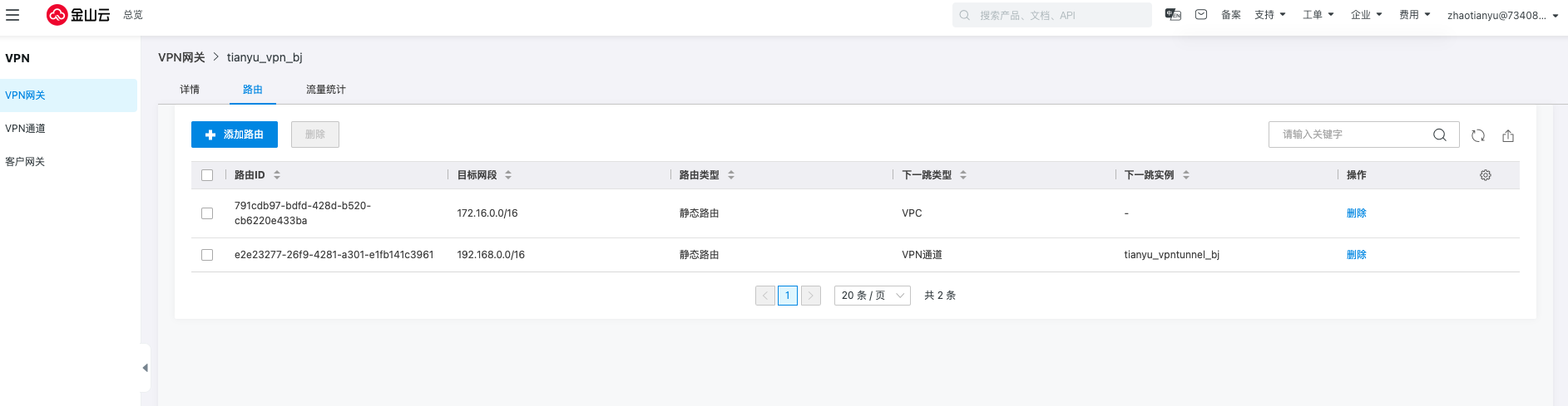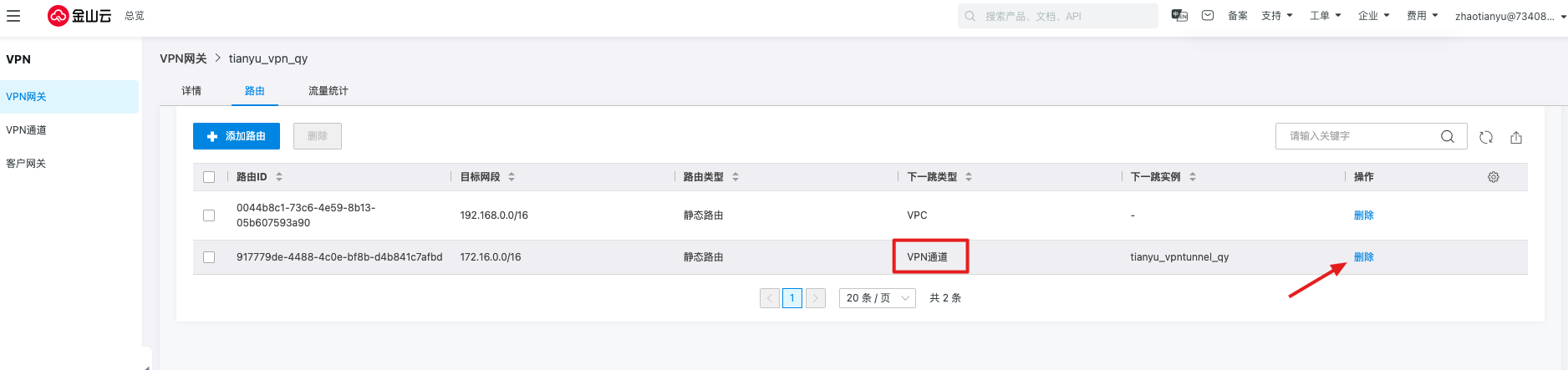 进入VPN网关详情,选择路由并删除指向通道的路由。