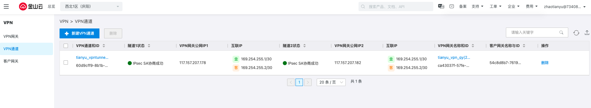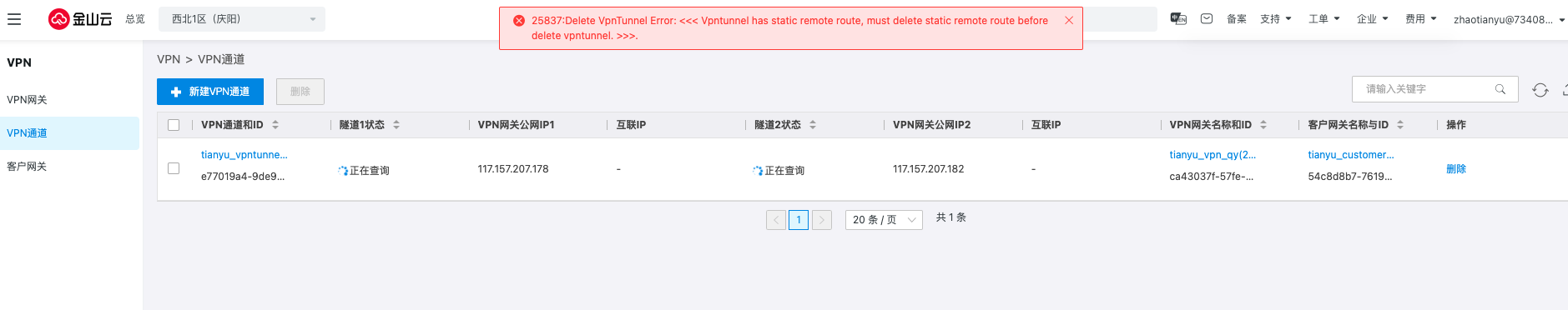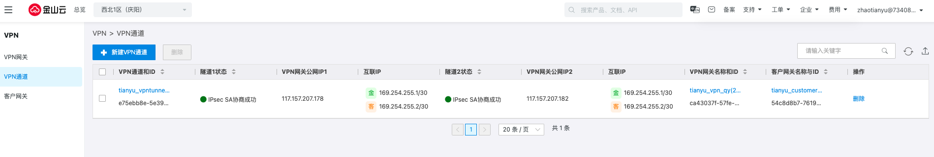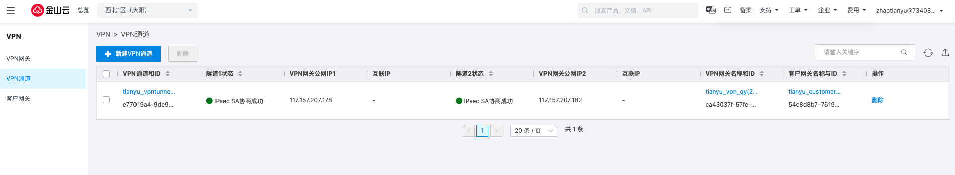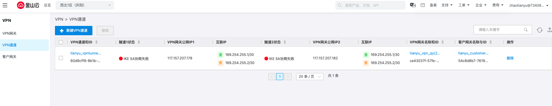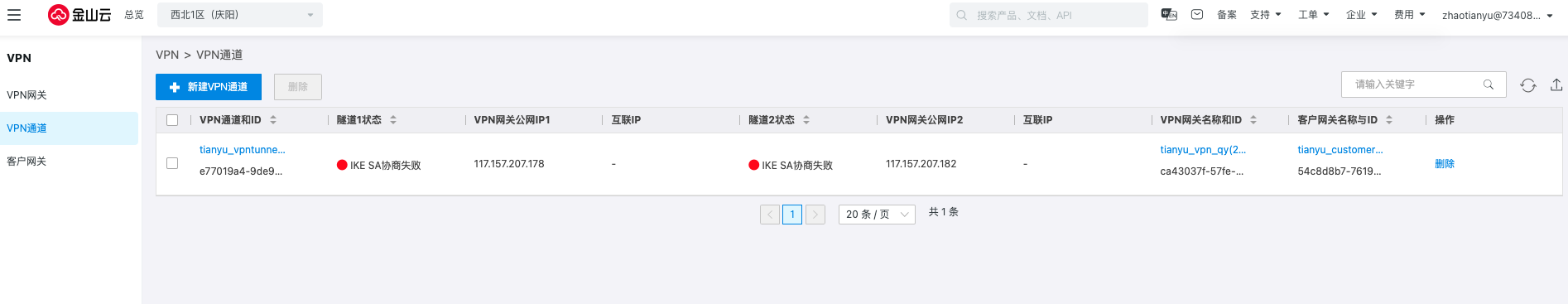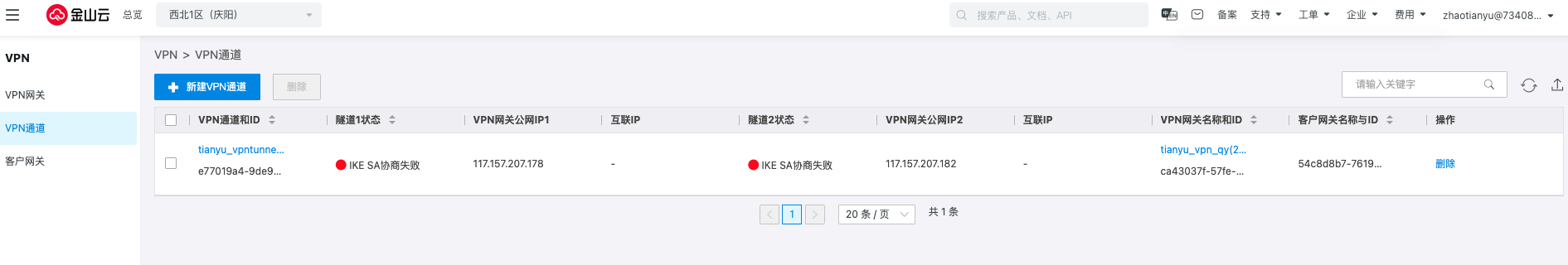 返回VPN通道,可以看到隧道的协商状态变更为失败,单击删除即可。