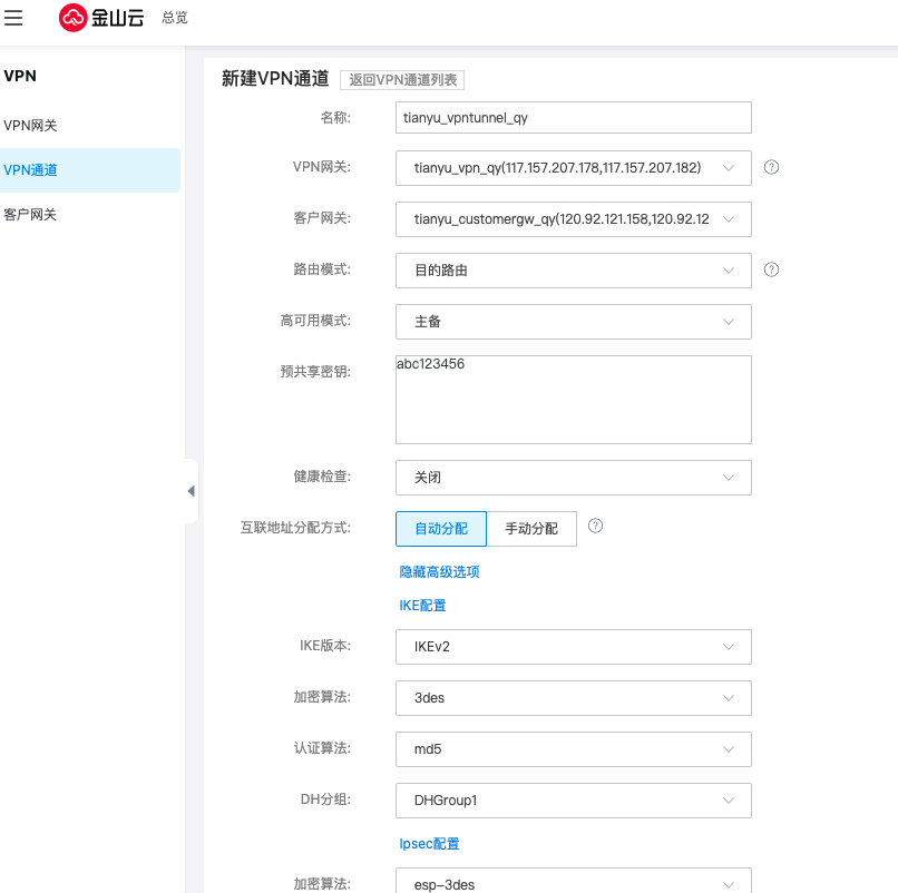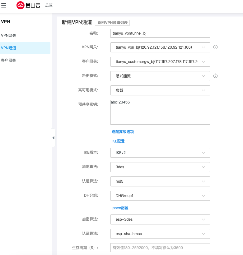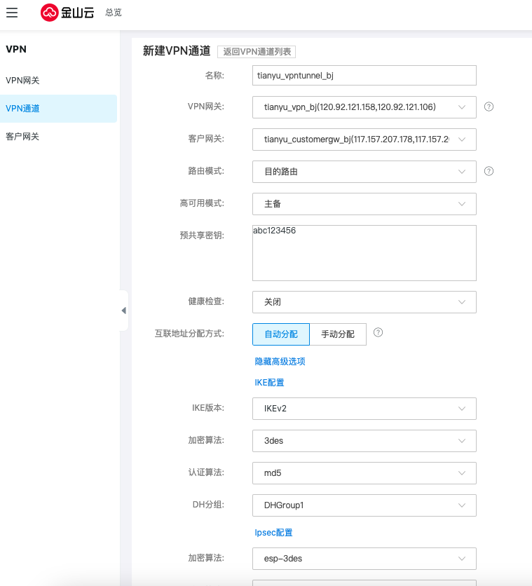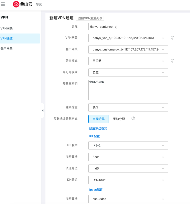 创建北京地域下的VPN网关下的VPN通道,路由模式选择目的路由,高可用模式默认选择负载,预共享密钥按需求填写,但需要保证两端的密钥配置相同。协商阶段的参数均采用默认值。