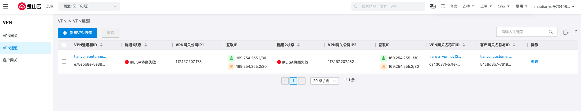 单击创建,此时庆阳地域下的VPN通道两条隧道的协商状态都是失败的。
