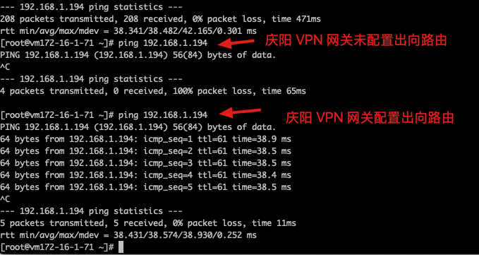 此时因为对端庆阳地域下的VPN网关还没有配置指向通道的路由,因此连通性测试失败。需要配置对端庆阳地域下的VPN网关指向通道的路由,再次测试连通性,结果可以ping通。