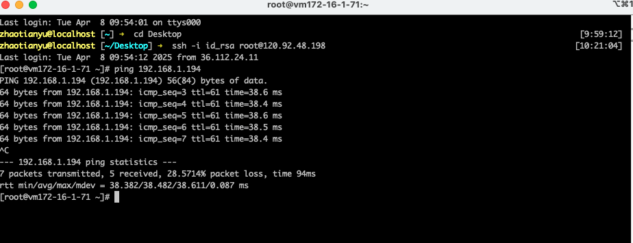 登录北京地域下的VM1(tianyu_vpn_vm_bj)ping对端庆阳地域下的VM2(tianyu_vpn_vm_qy)。到这里,VPN(目的路由+负载)配置工作已完成。