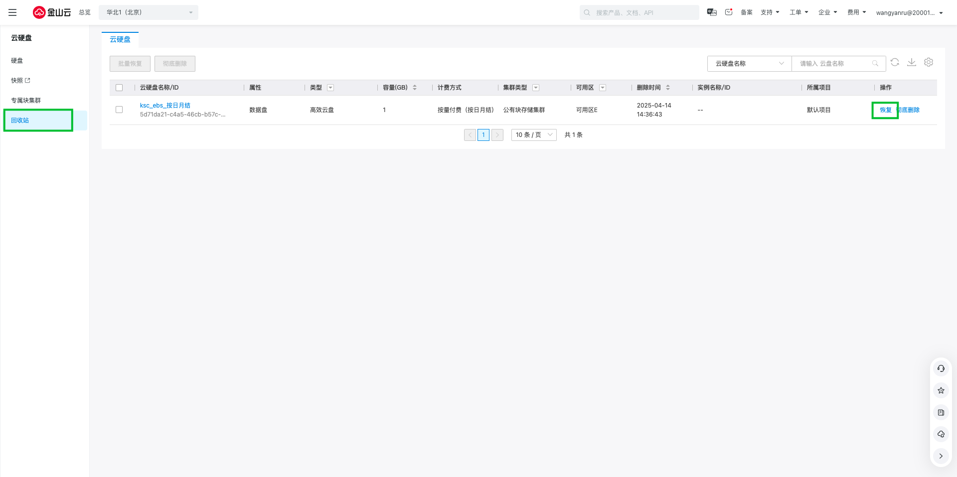 金山云提供云硬盘回收站,用户可以对回收站内的云硬盘进行恢复操作。当到期或被删除的云硬盘超出回收站的保留时长后,云硬盘将被彻底删除,硬盘上的数据不可恢复。