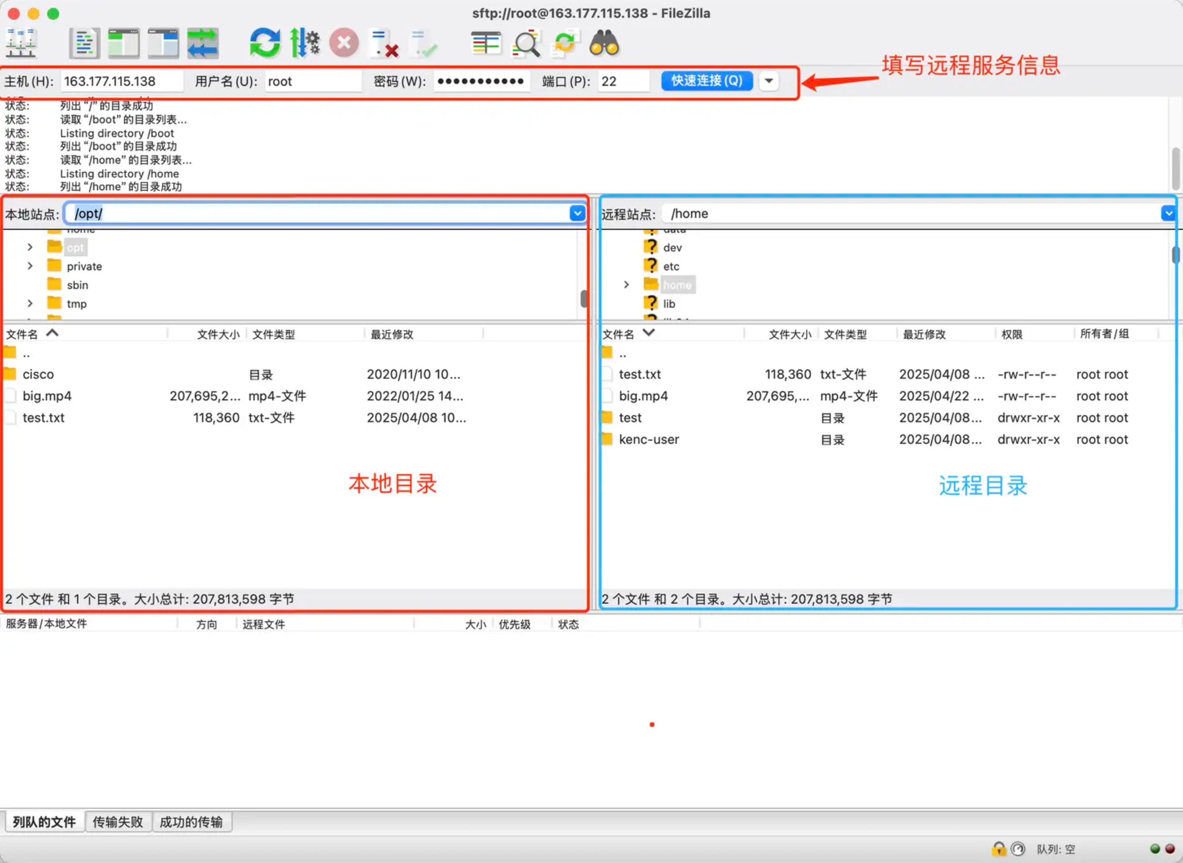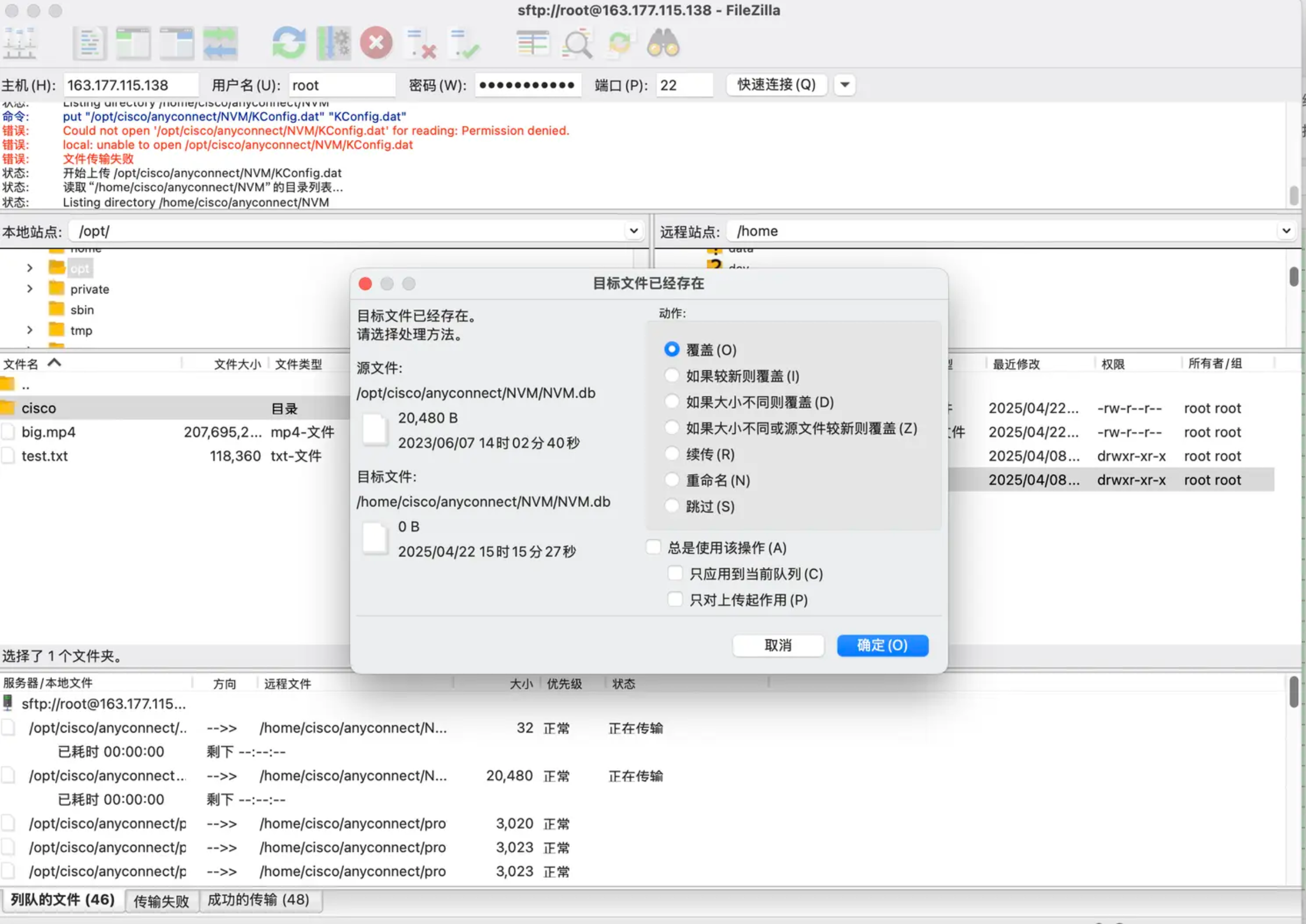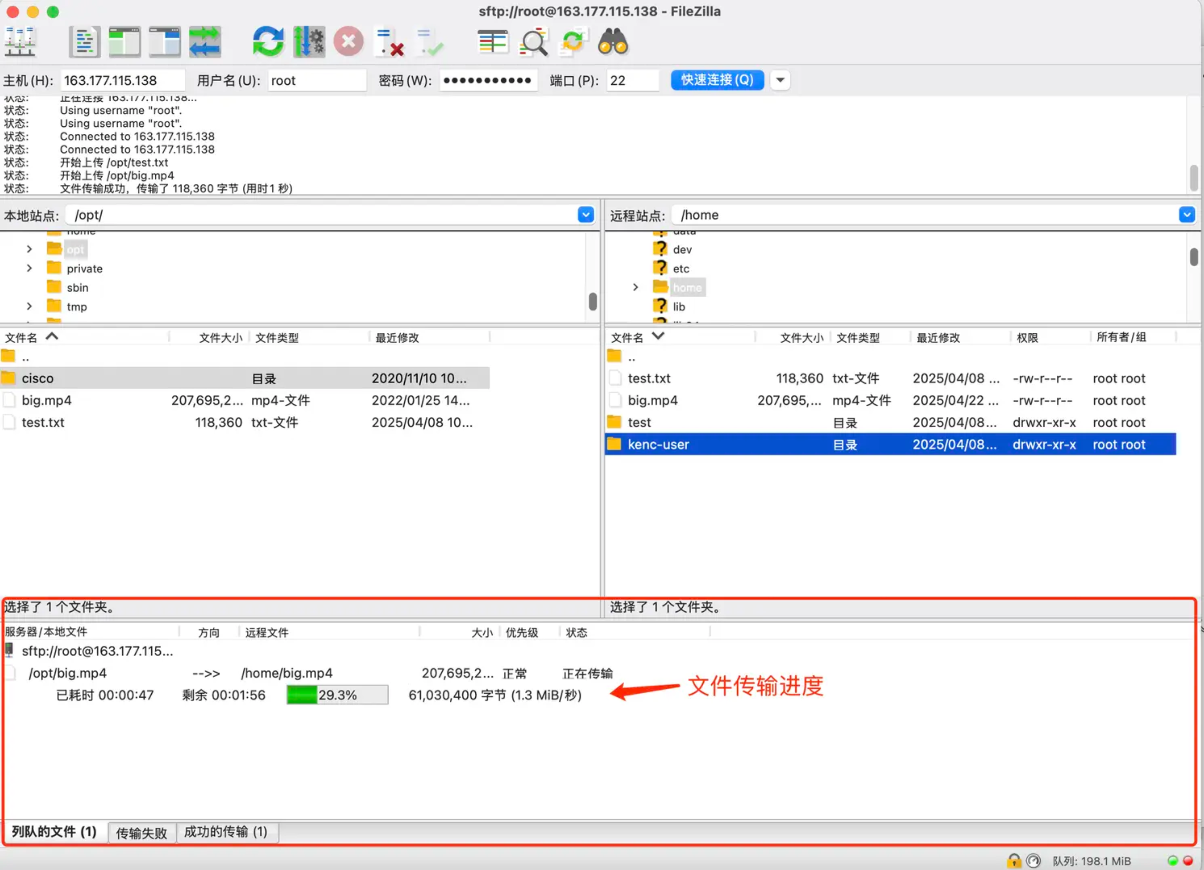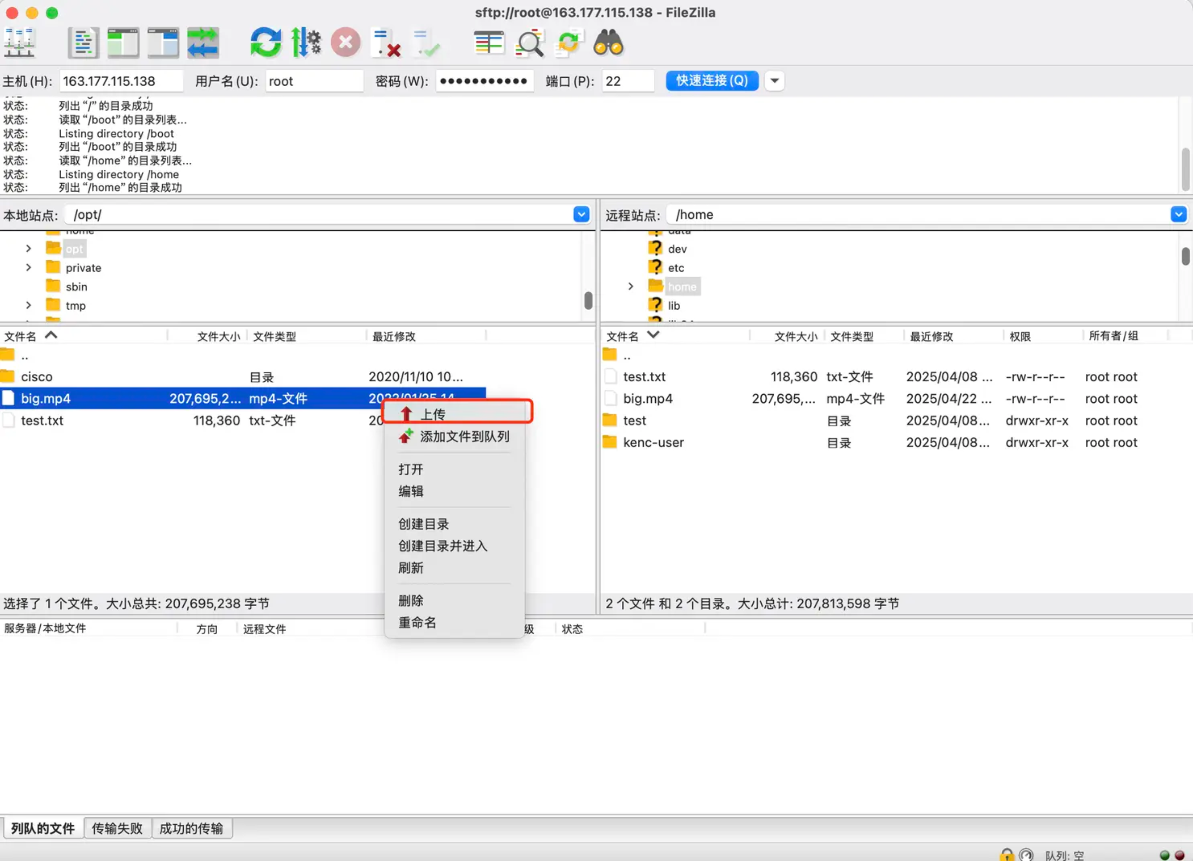 选中文件点击上传即可,可以选中多个文件或者目录上传到指定远端目录。当然,双击多拽也可以实现相同的效果。同时FileZilla支持断点续传,文件覆盖或重命名等功能。