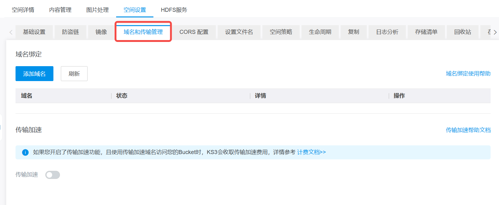 在域名和传输管理页面,单击【传输加速】按钮。