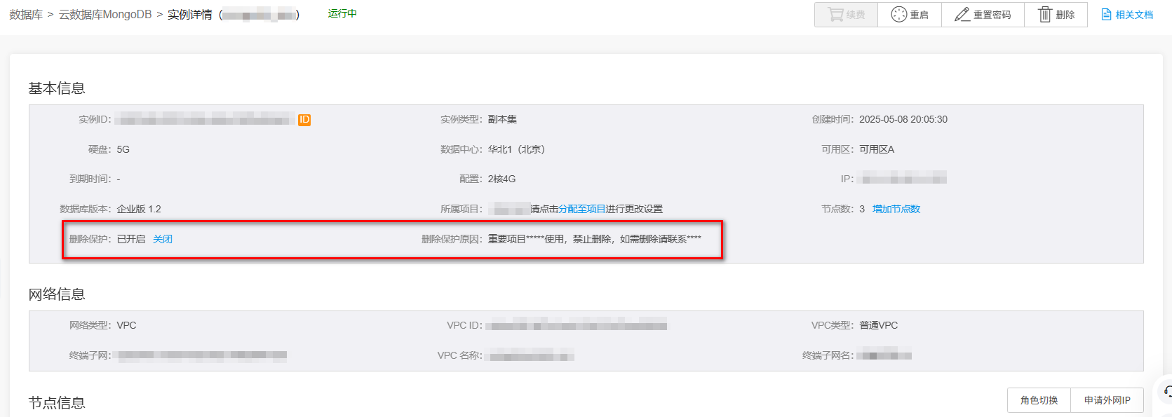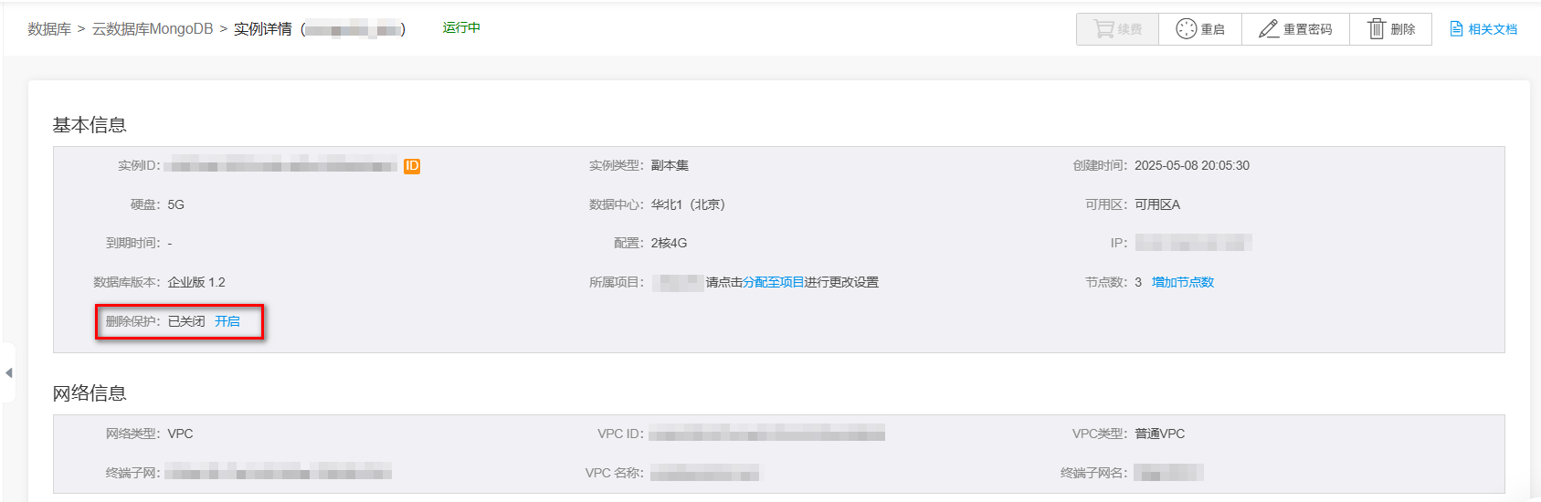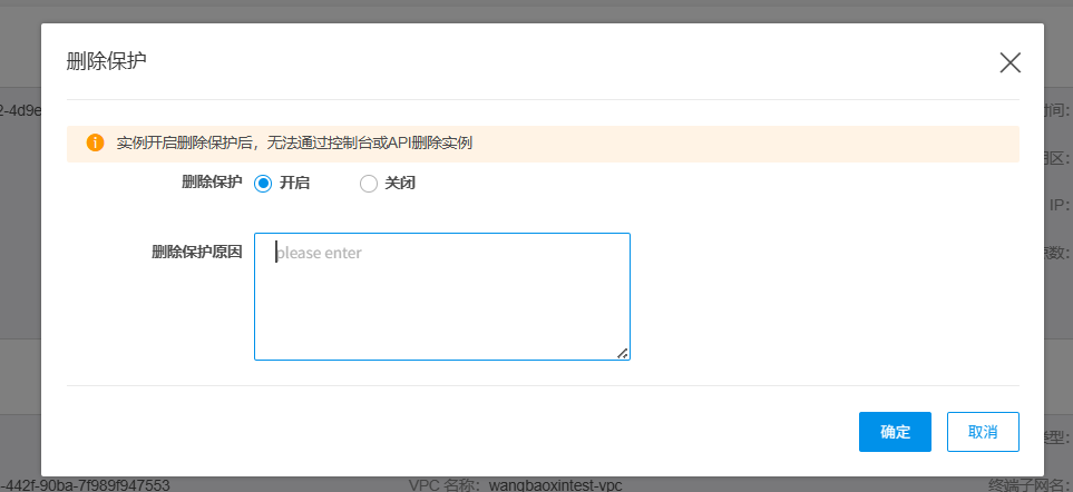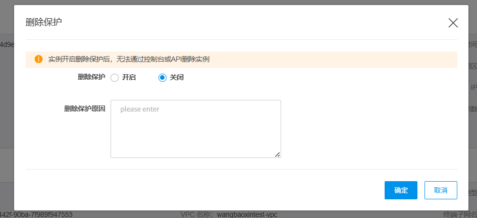 实例开启删除保护后,无法通过控制台或API删除实例,可减少误删除实例操作的情况发生。关闭删除保护后,方可通过控制台或API删除实例。