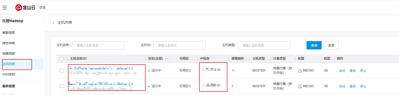 进入集群详情页,左侧导航栏选择主机列表,主机列表中IP信息字段即为HDFS节点地址。